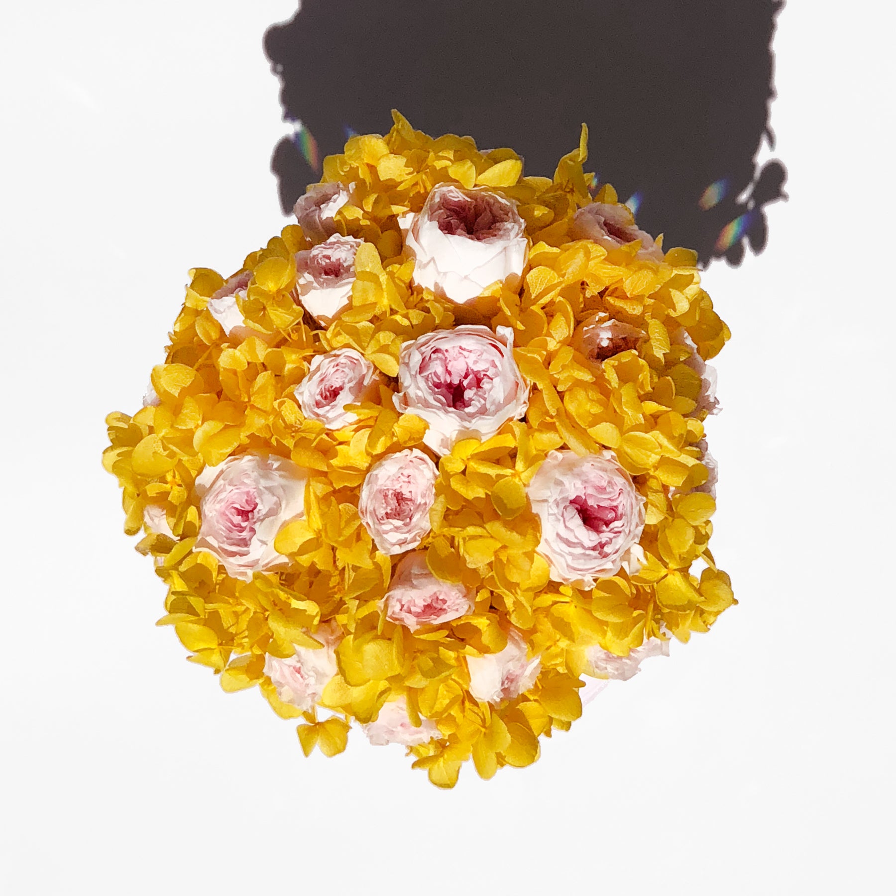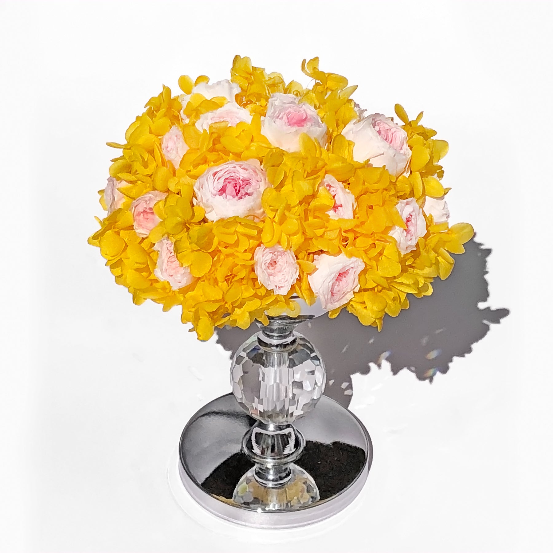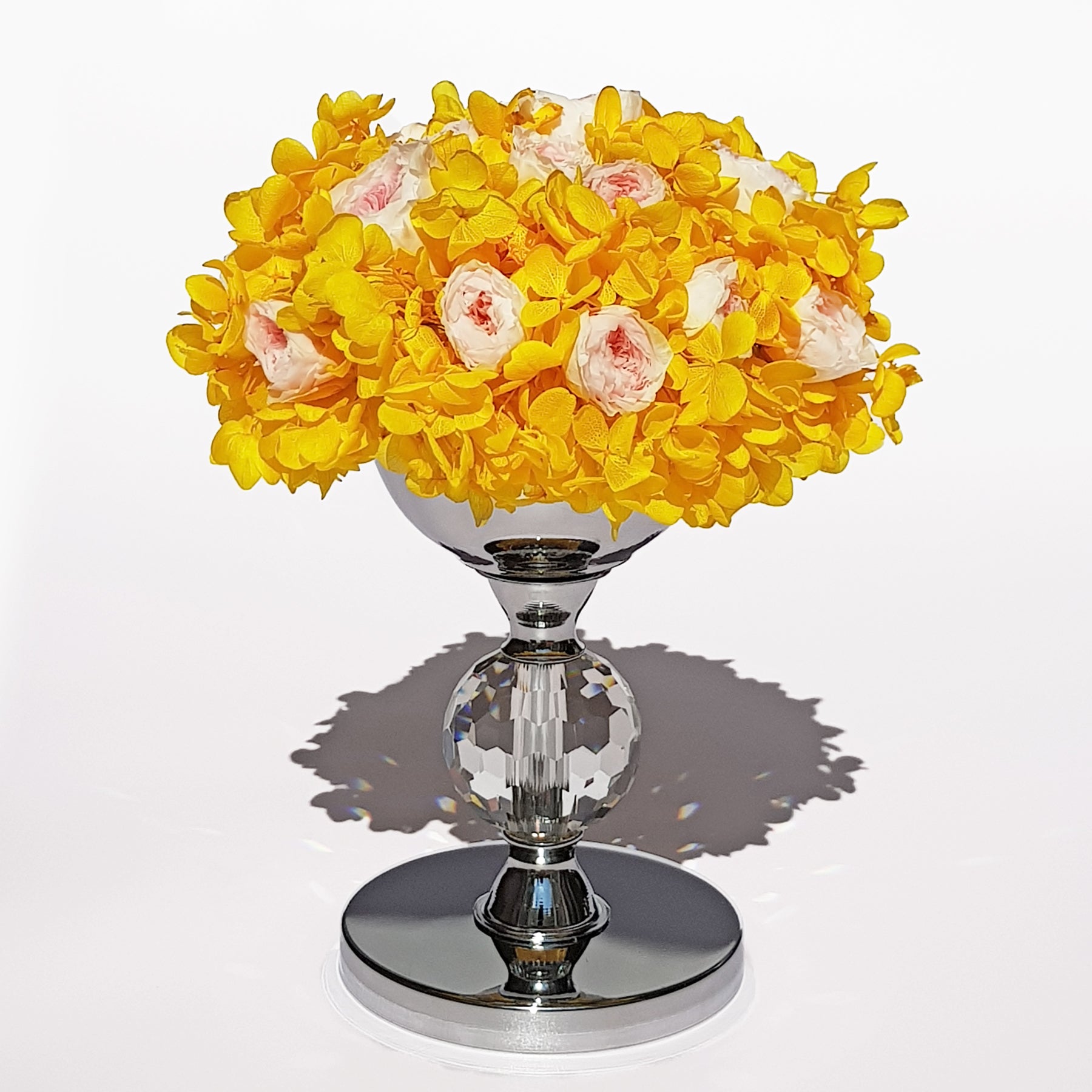 Arriving in a metallic vase with a centered crystal sphere, you’ll find heavenly pink Austin roses and yellow hydrangea. This euphoric bouquet exudes happiness and delight, which you can enjoy and admire for an entire year.