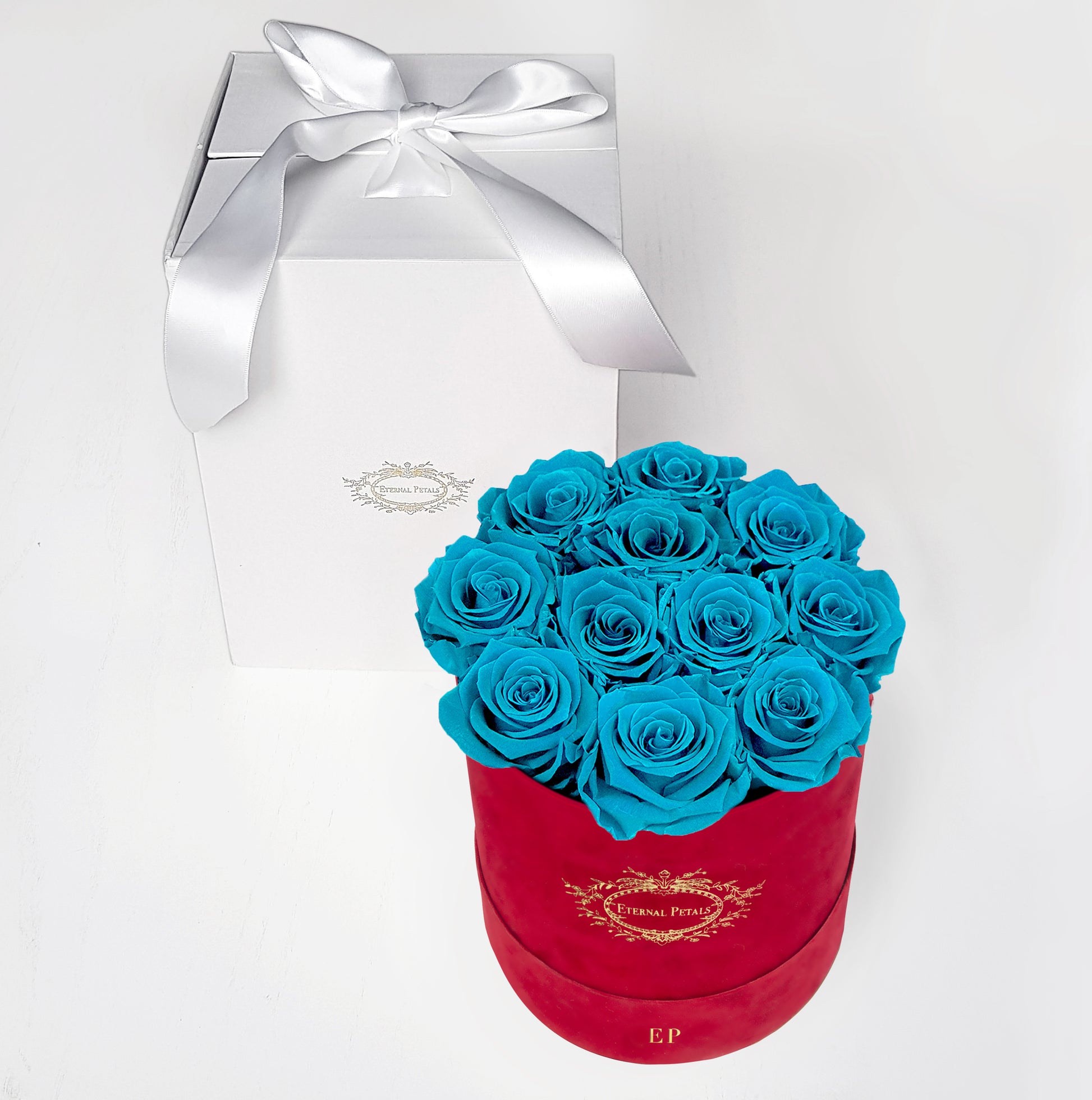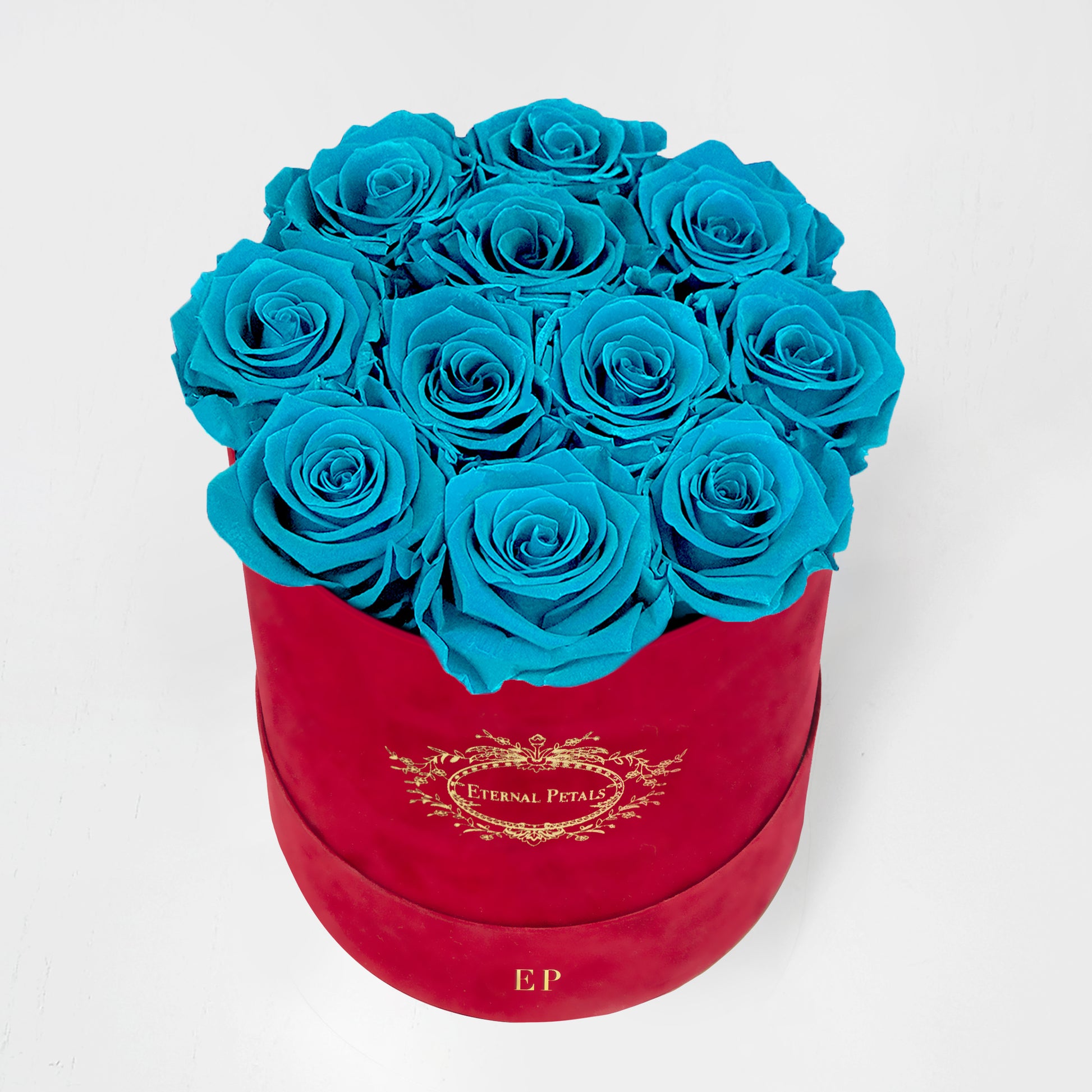 In the pictures you can see a Teal colour rose inside our elegant round box.