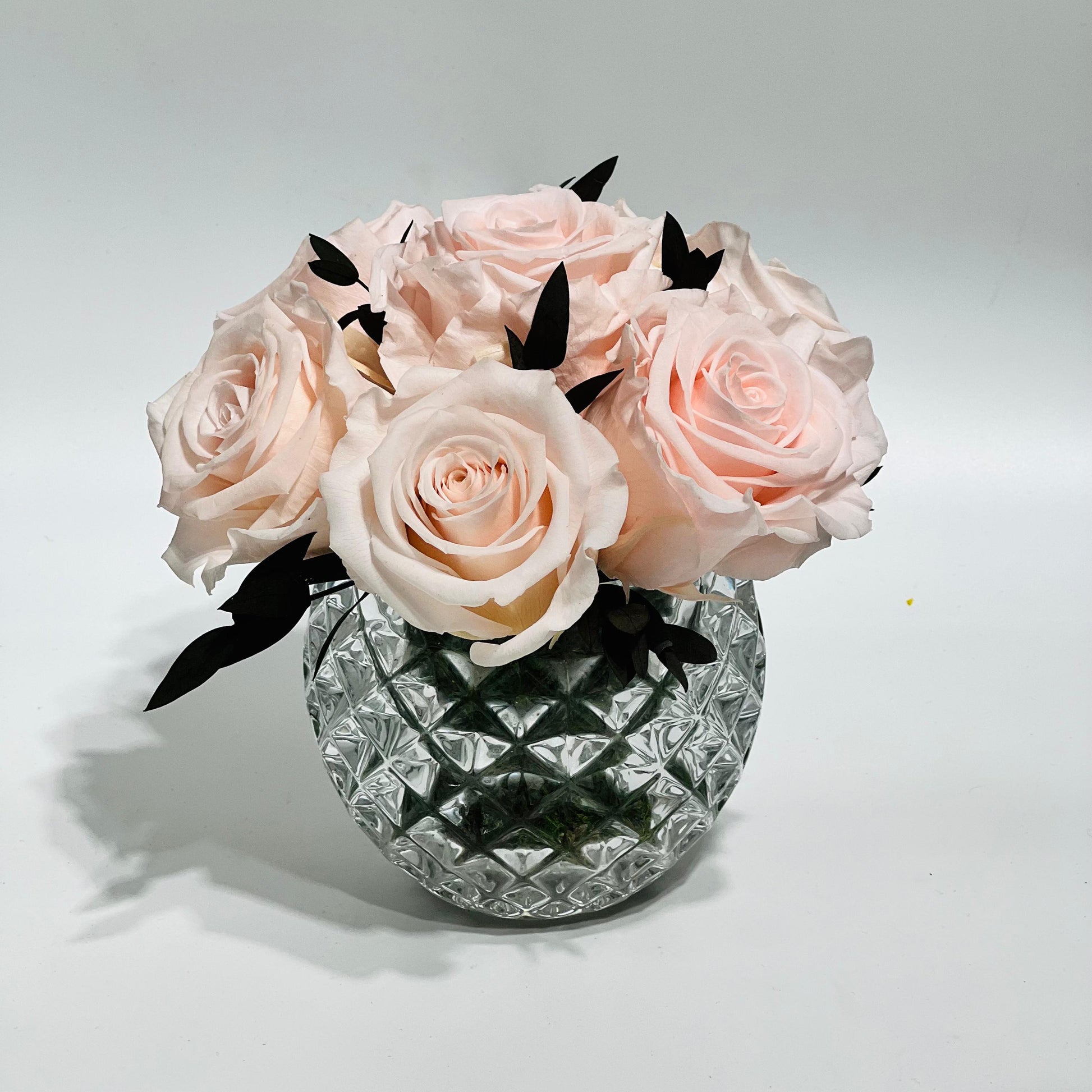Arriving in this stunning crystal vase, you’ll find 7 perfectly bloomed, Blush roses in authentically beautiful blush colour. Light roses are the symbol of innocence and purity, which you can enjoy and admire for a whole year.