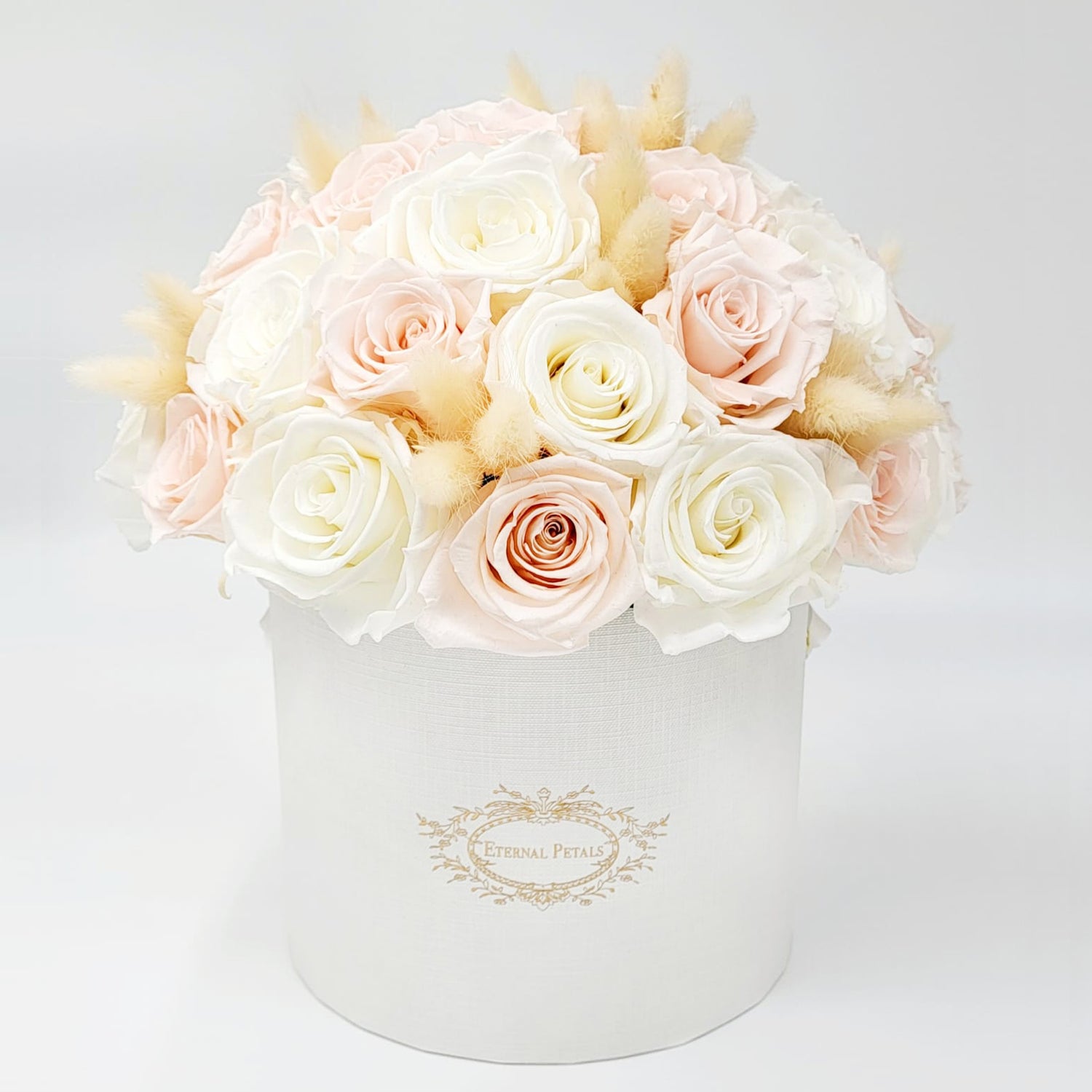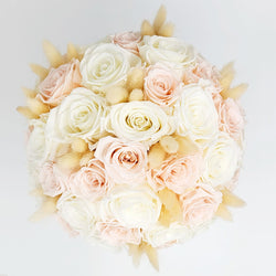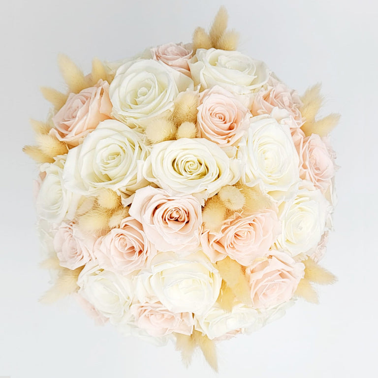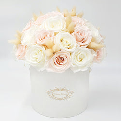 Arriving in branded Eternal Petals round box, you’ll find perfectly bloomed white and blush roses mixed with bunny tails. This beautiful bouquet is the ultimate representation of eternal love and beauty, which you can enjoy and admire for an entire year.
