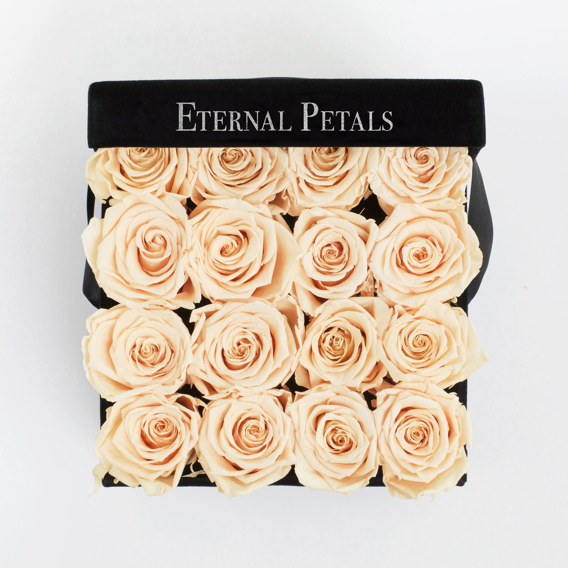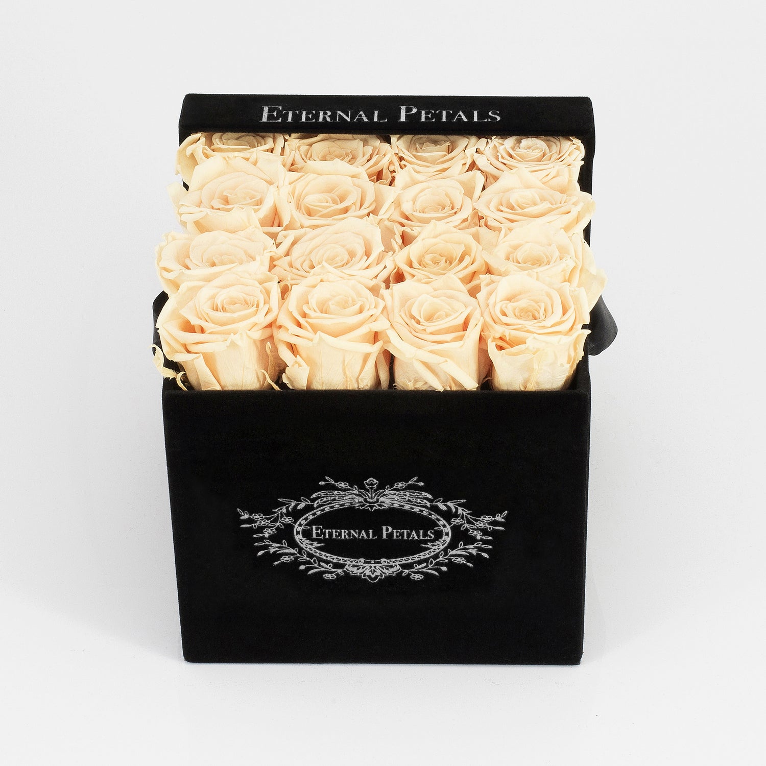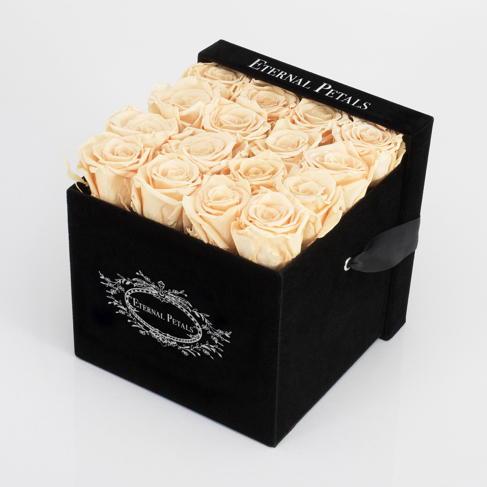 These stunning champagne roses peek romantically out of their beautiful black flower box, creating a luxurious bold finish. A warm and rich alternative to a white rose, the champagne tones are sumptuous and unique, perfect to pair in an elegant and contemporary home or for a sweet token of love. A perfect gift!