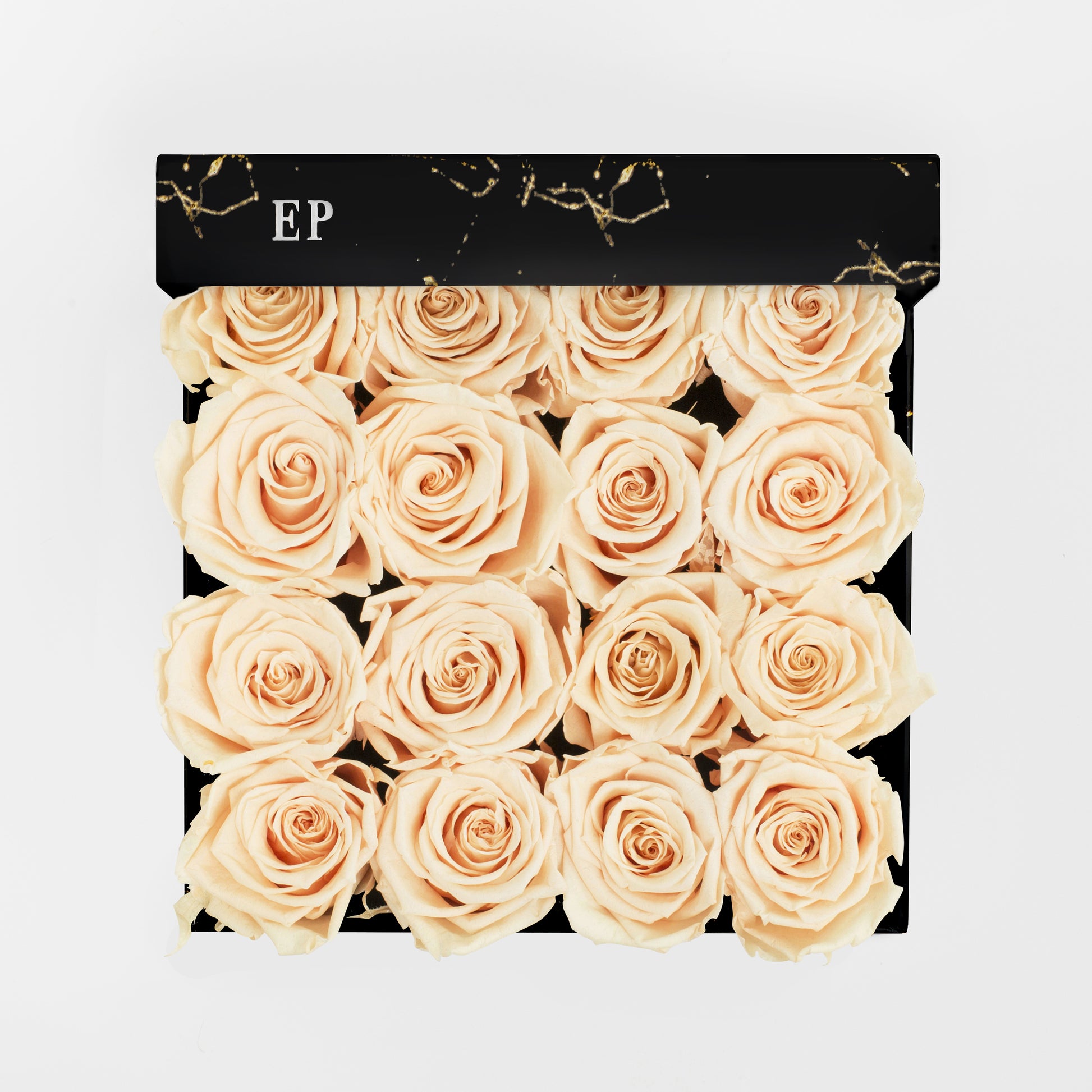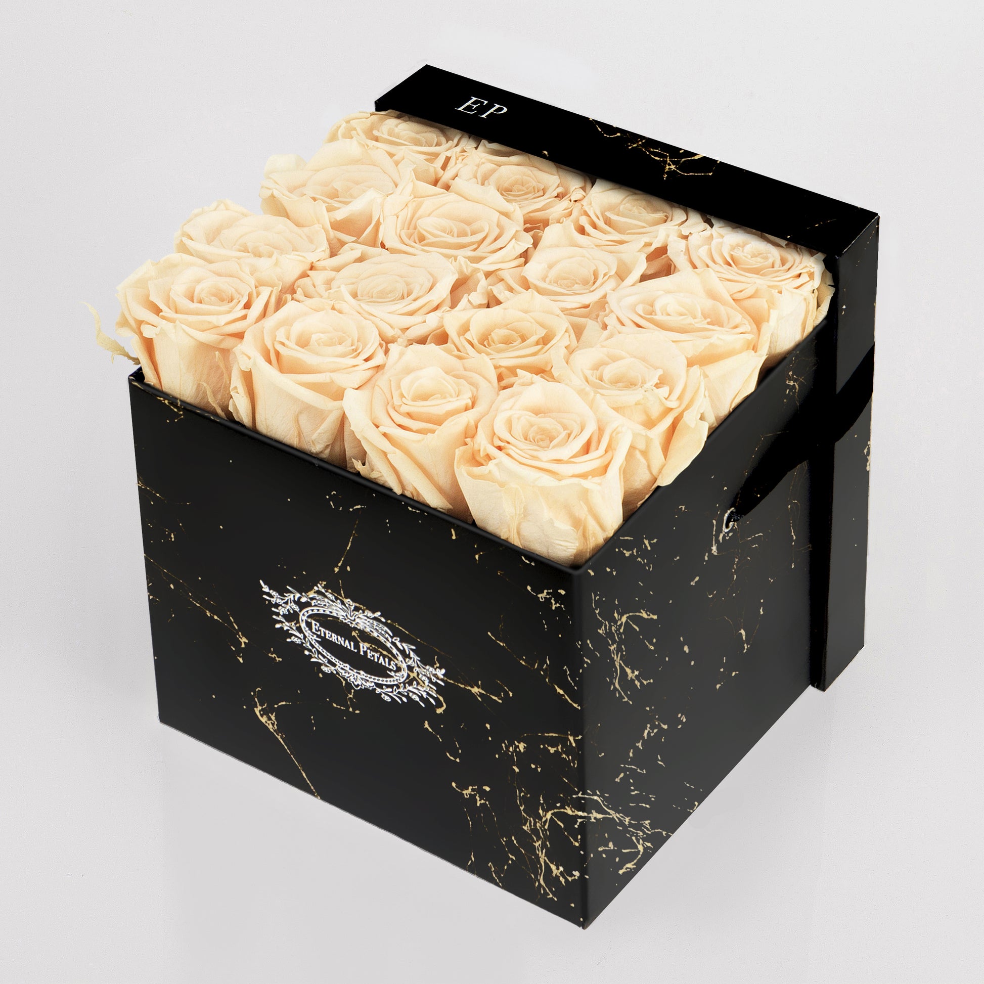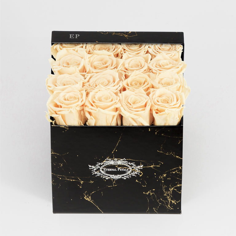 These stunning champagne roses peek romantically out of their beautiful marble box, creating a luxurious pastel finish. A warm and rich alternative to a white rose, the champagne tones are sumptuous and unique, perfect to pair in an elegant and contemporary home or for a sweet token of love. The perfect gift!