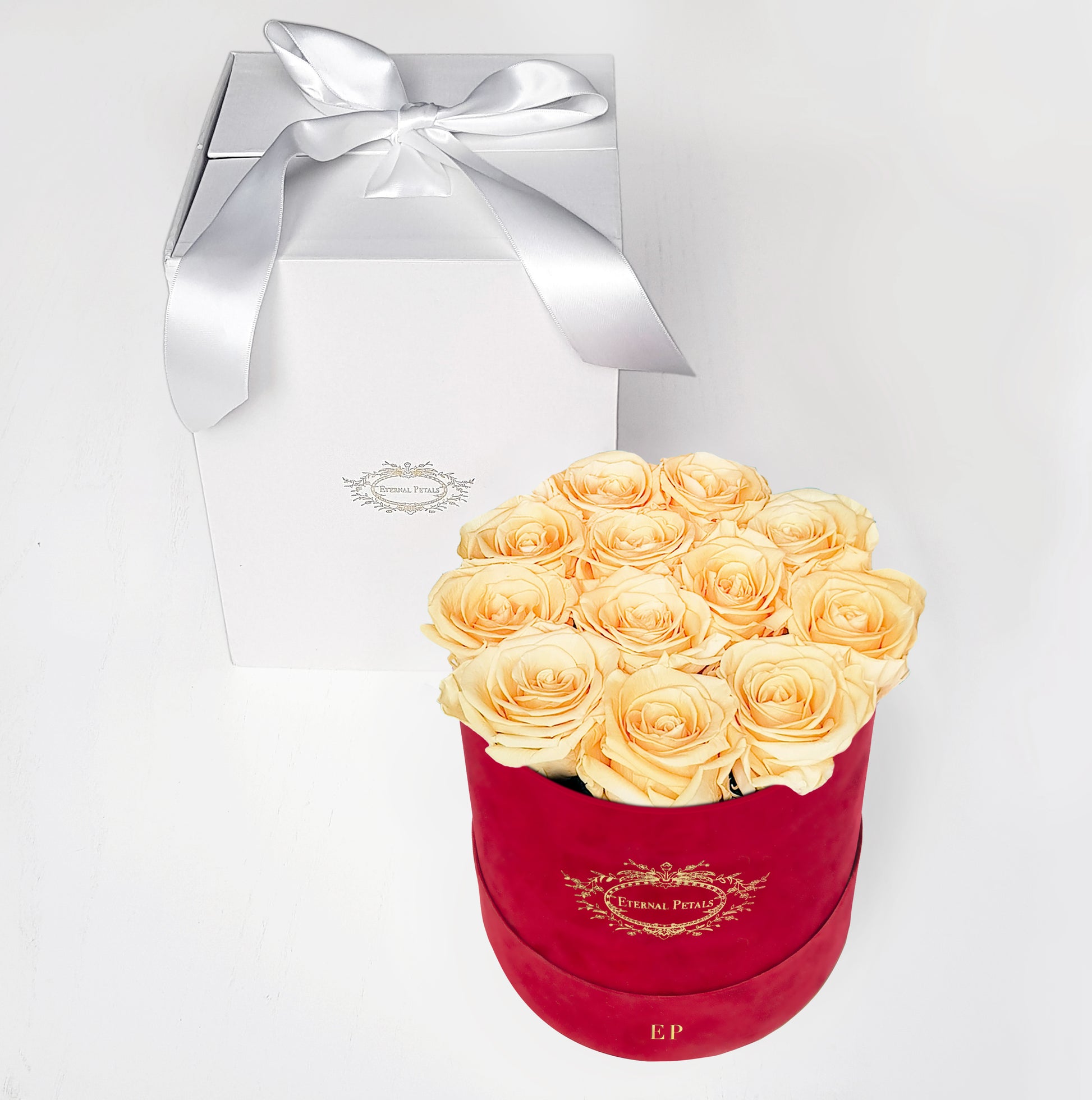 In the pictures you can see a Champagne colour rose inside our elegant round box.