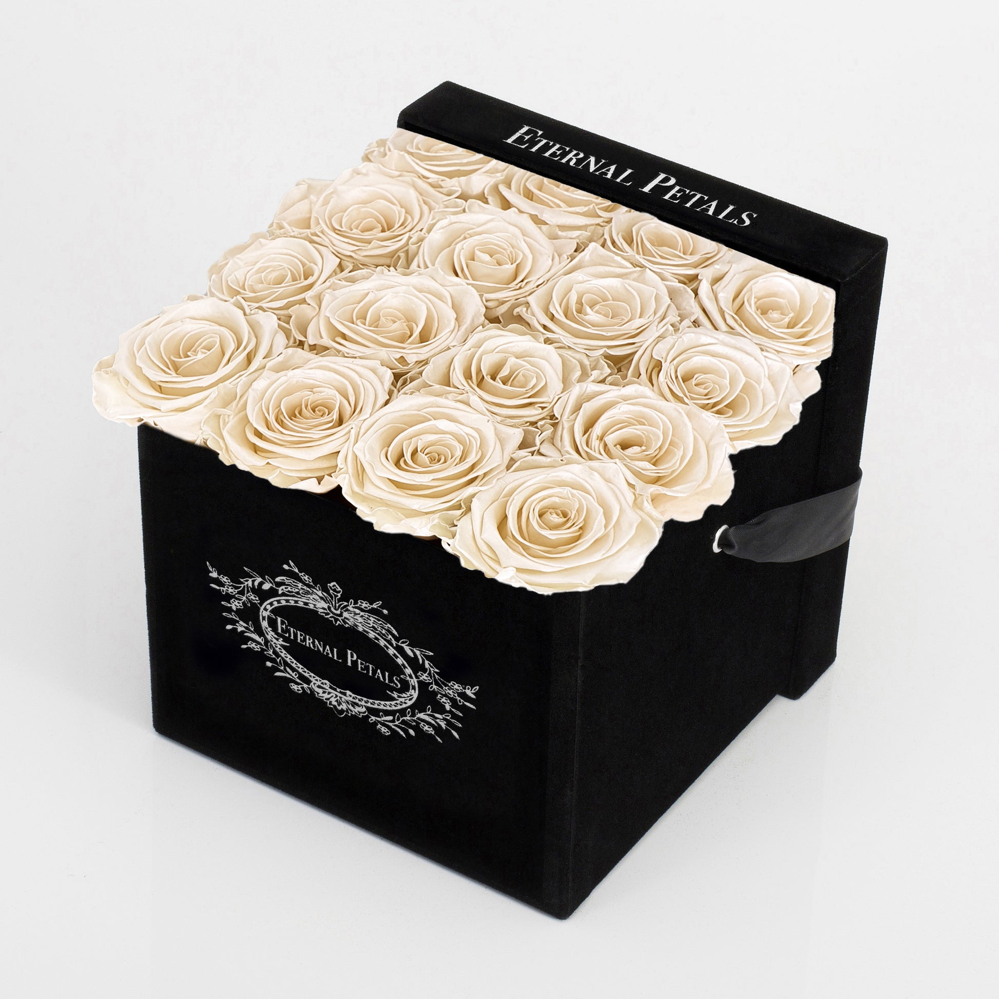In the pictures you can see Champagne Satin colour roses inside our luxury black flower box