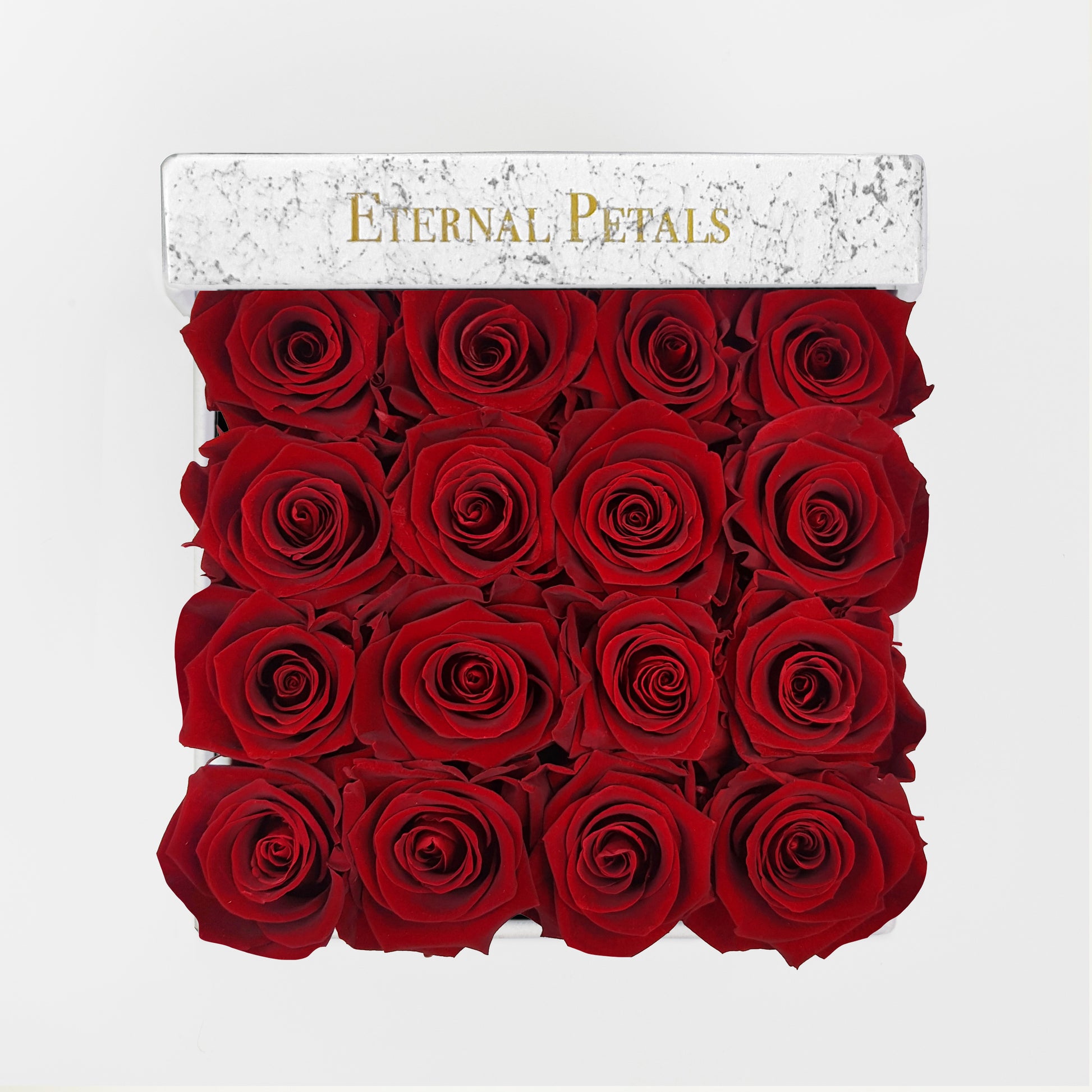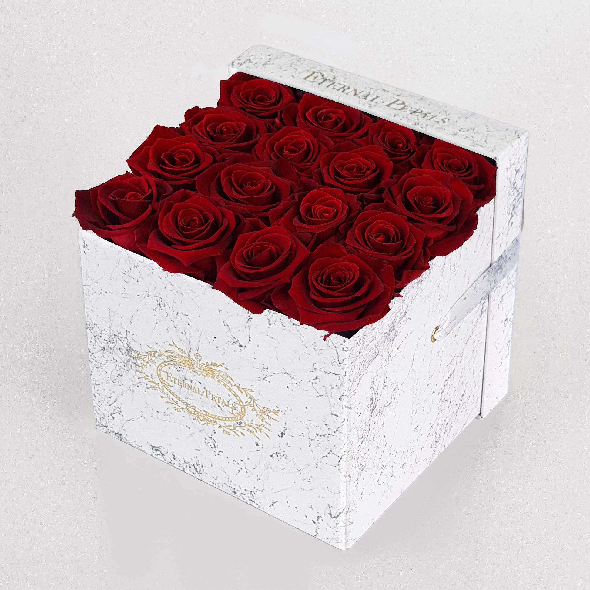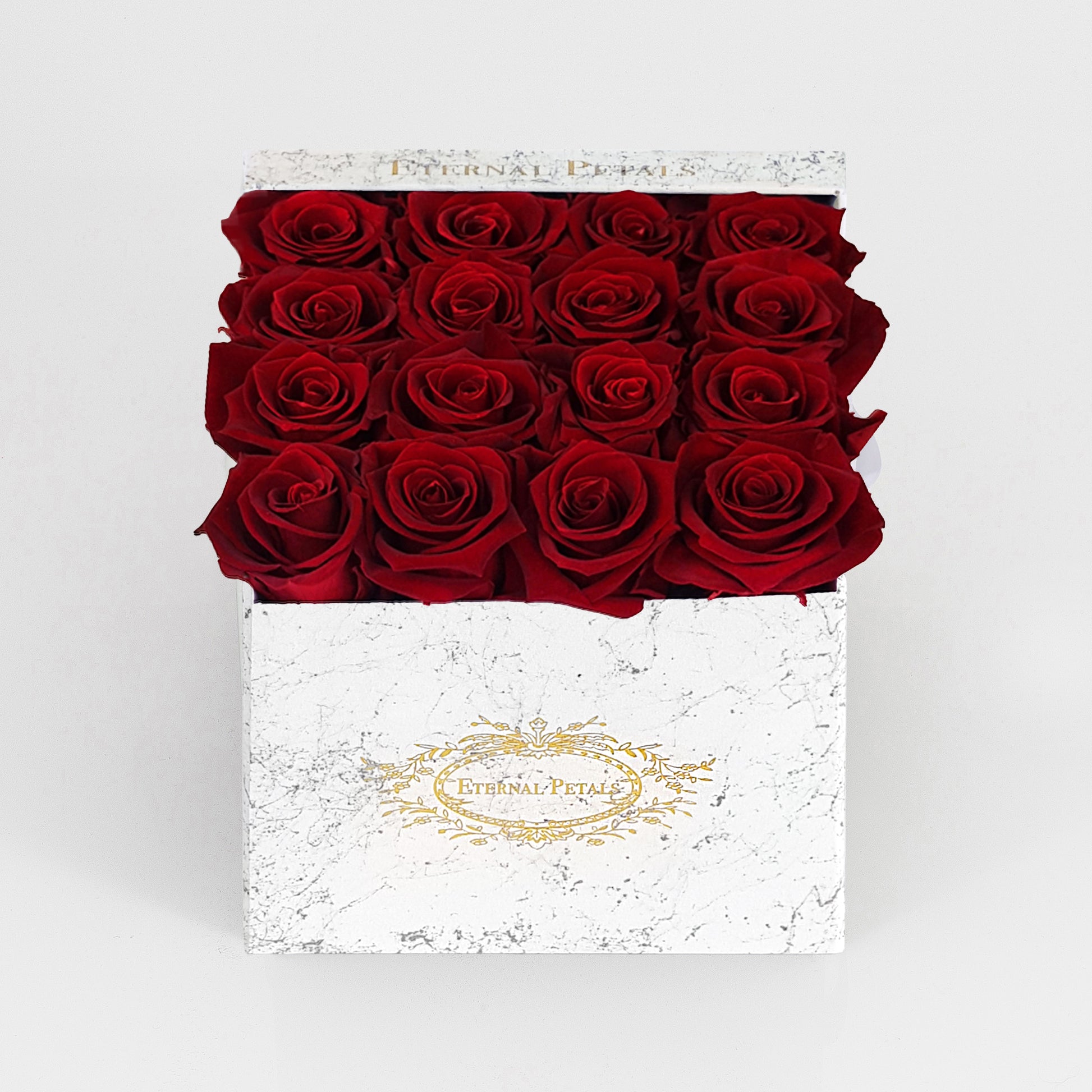 These stunning deep red roses peek romantically out of their beautiful marble box, creating a luxurious bold finish. A warm and rich alternative to a red rose, the deep red tones are sumptuous and unique, perfect to pair in an elegant and contemporary home or for a sweet token of love. The Perfect Gift!