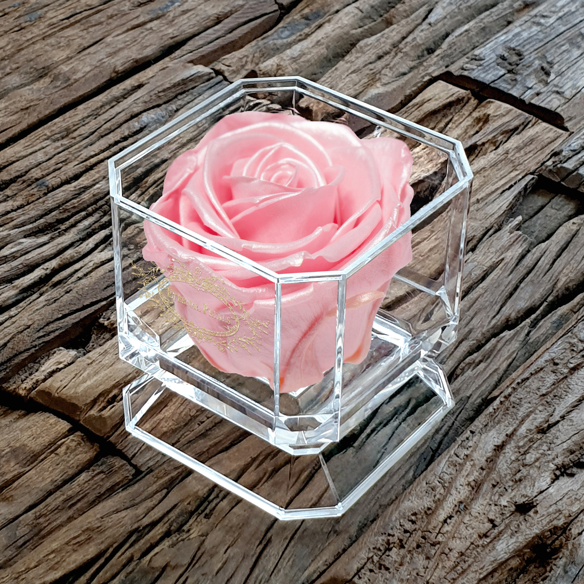 In the pictures you can see a Pink Satin colour rose inside our trendy Diamond box.