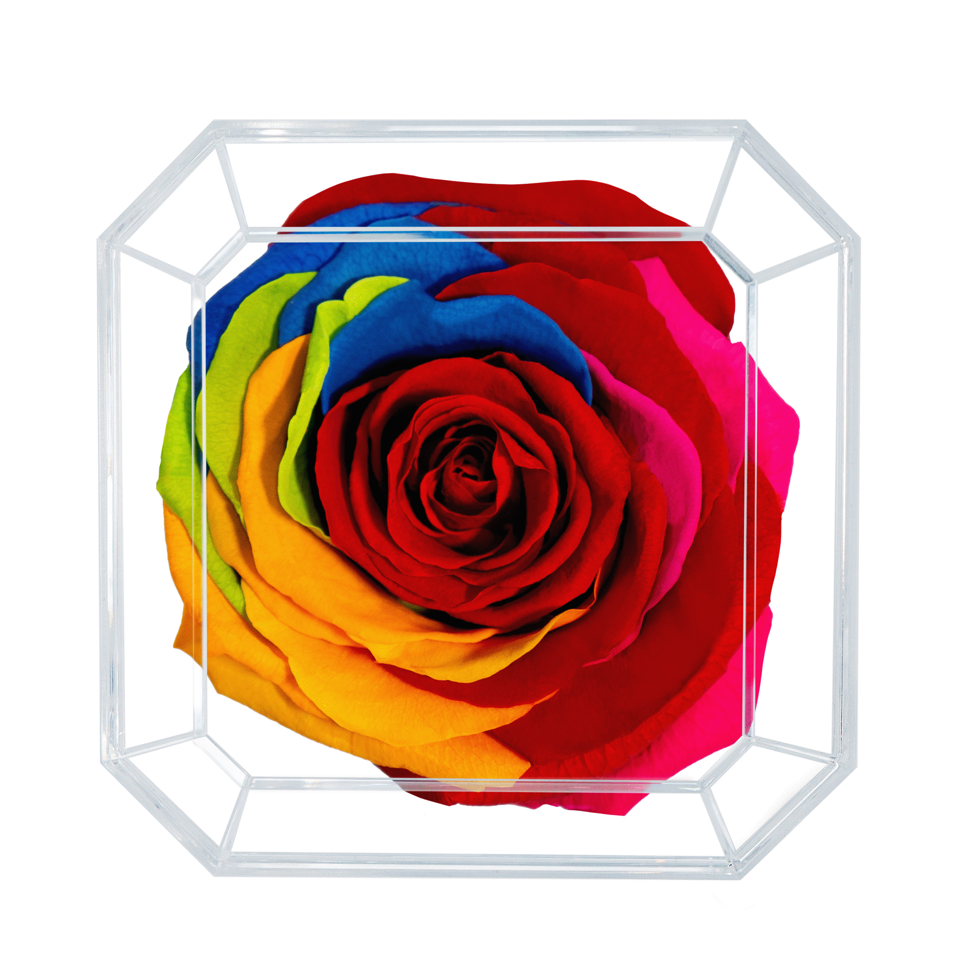 In the pictures you can see a Rainbow colour rose inside our trendy Diamond box.