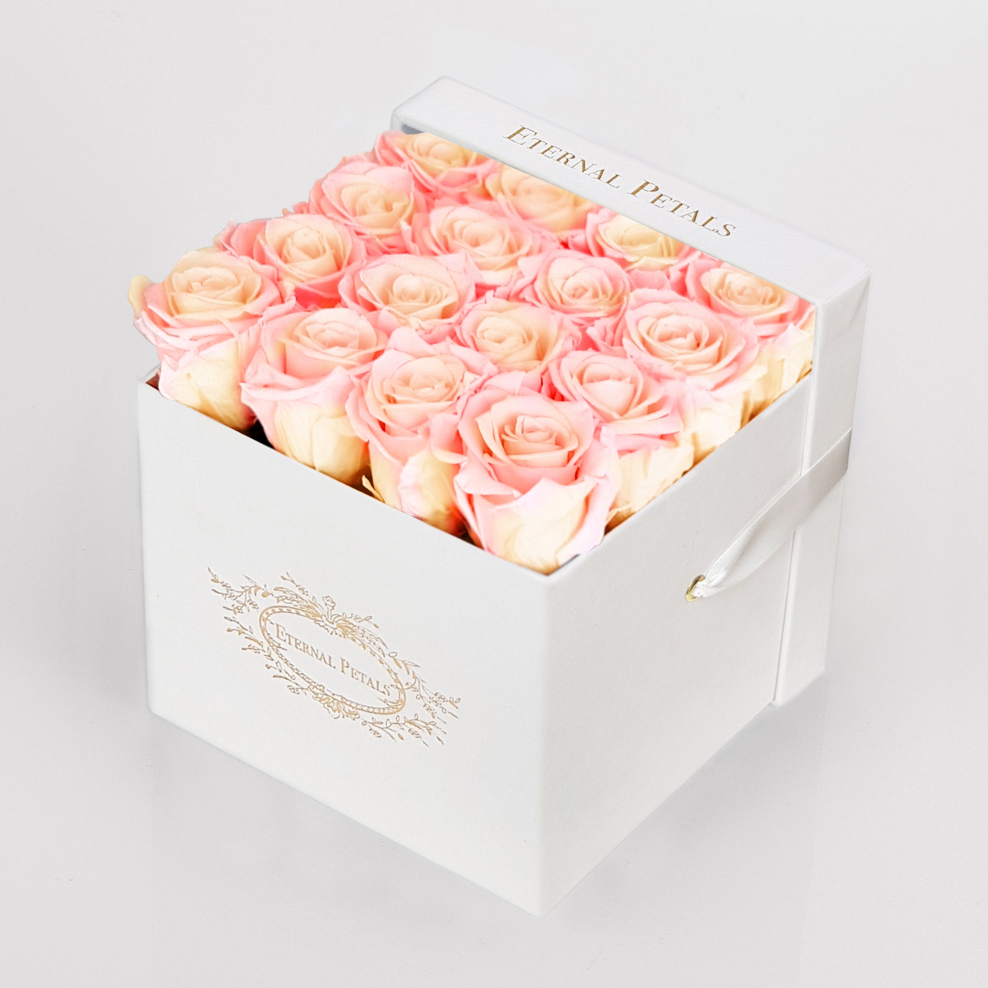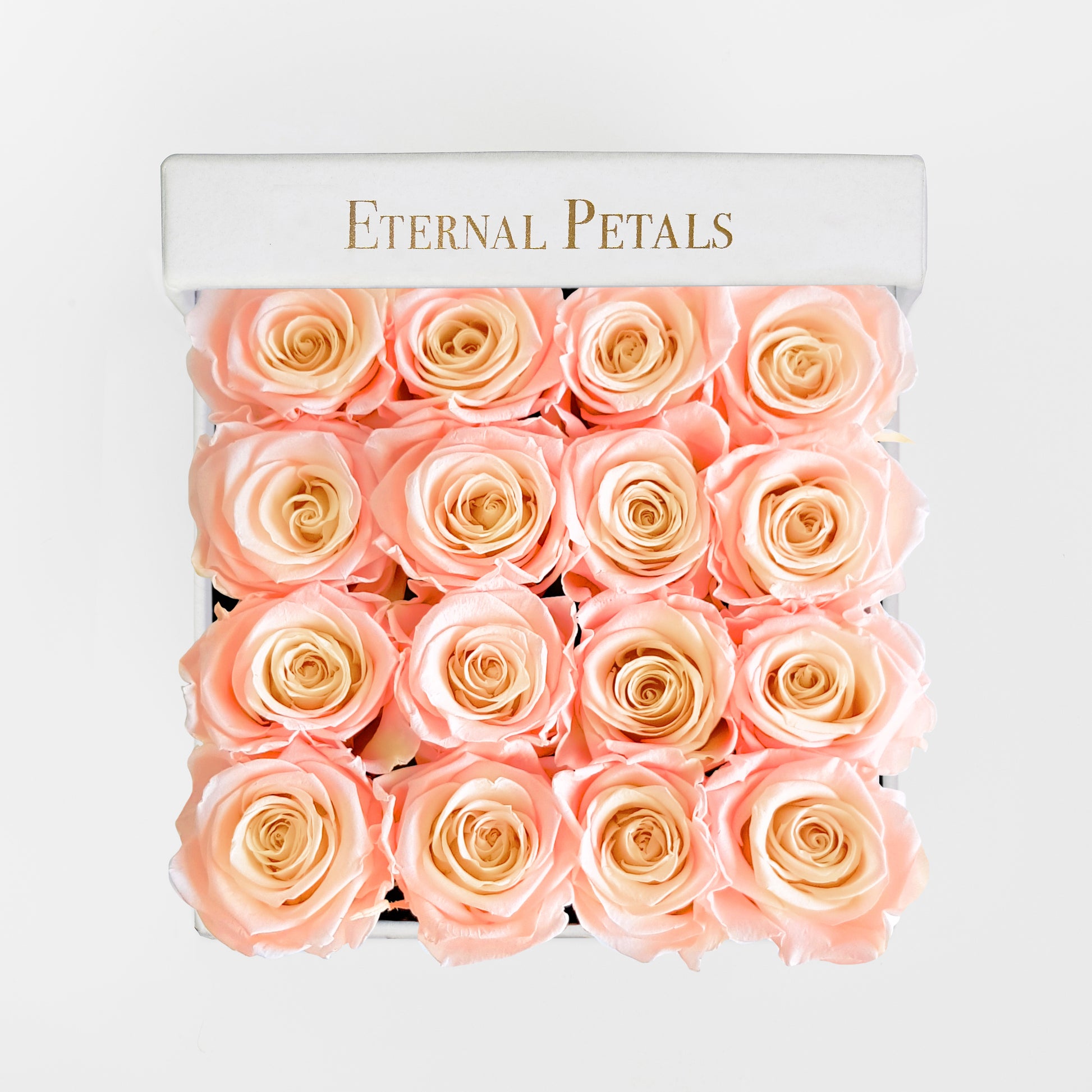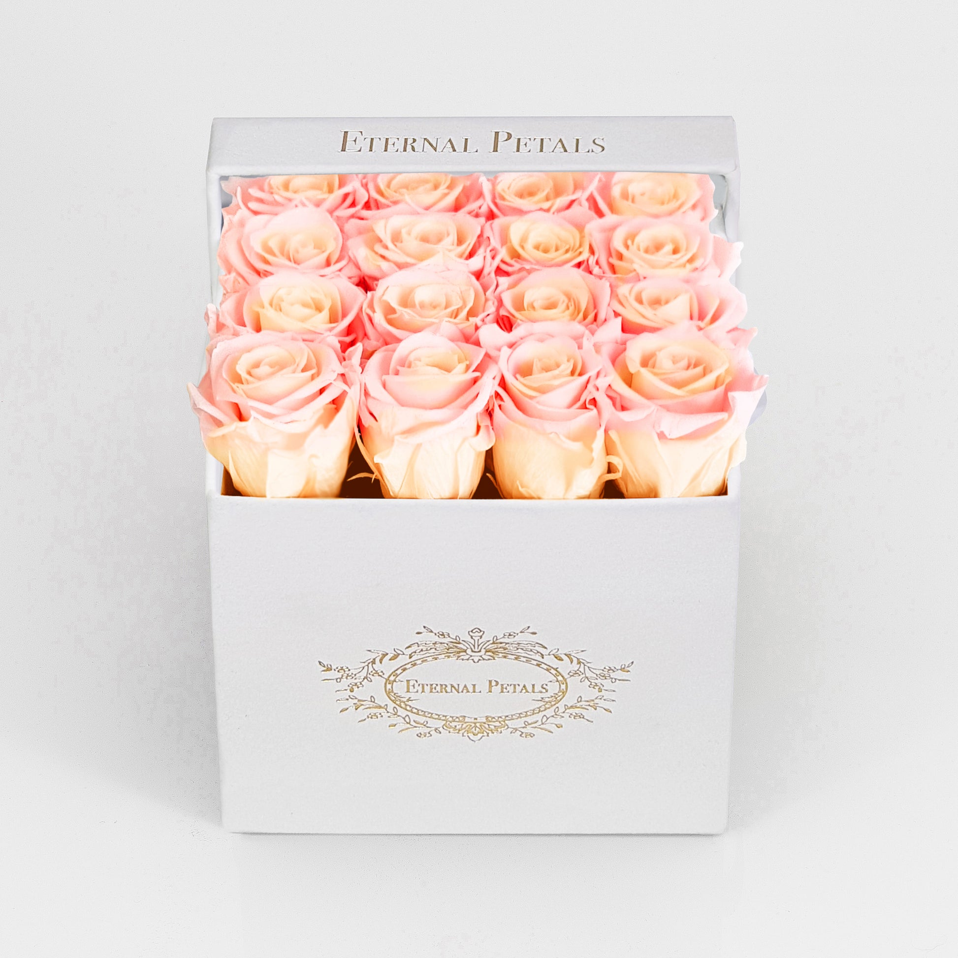 These stunning Double Peach roses peek romantically out of their beautiful white flower box, creating a luxurious bold finish. A warm and rich alternative to a peach rose, the double peach tones are sumptuous and unique, perfect to pair in an elegant and contemporary home or for a sweet token of love. A perfect gift!