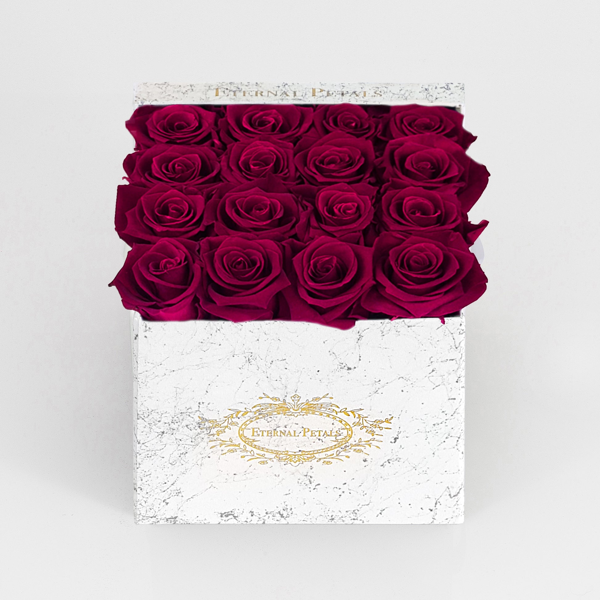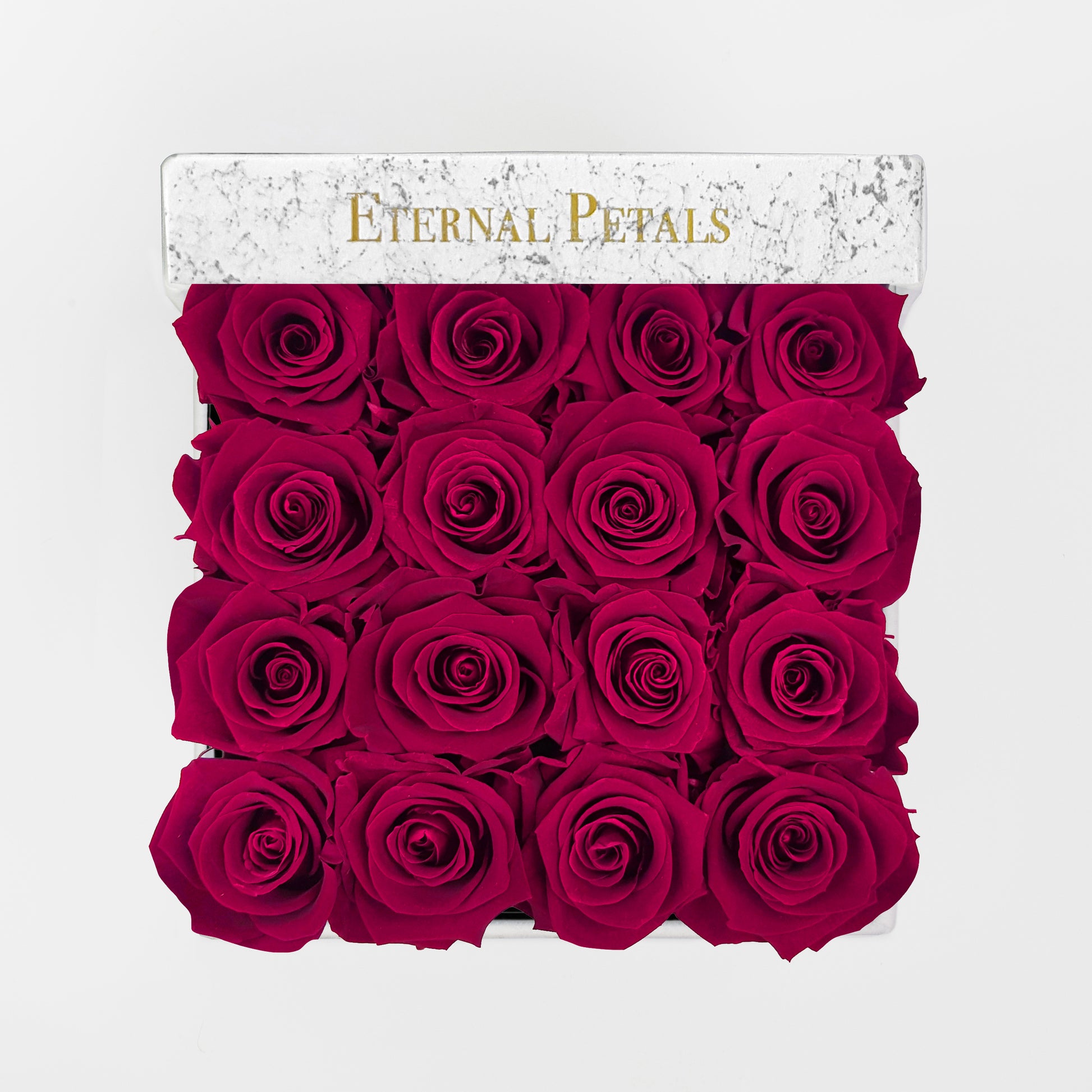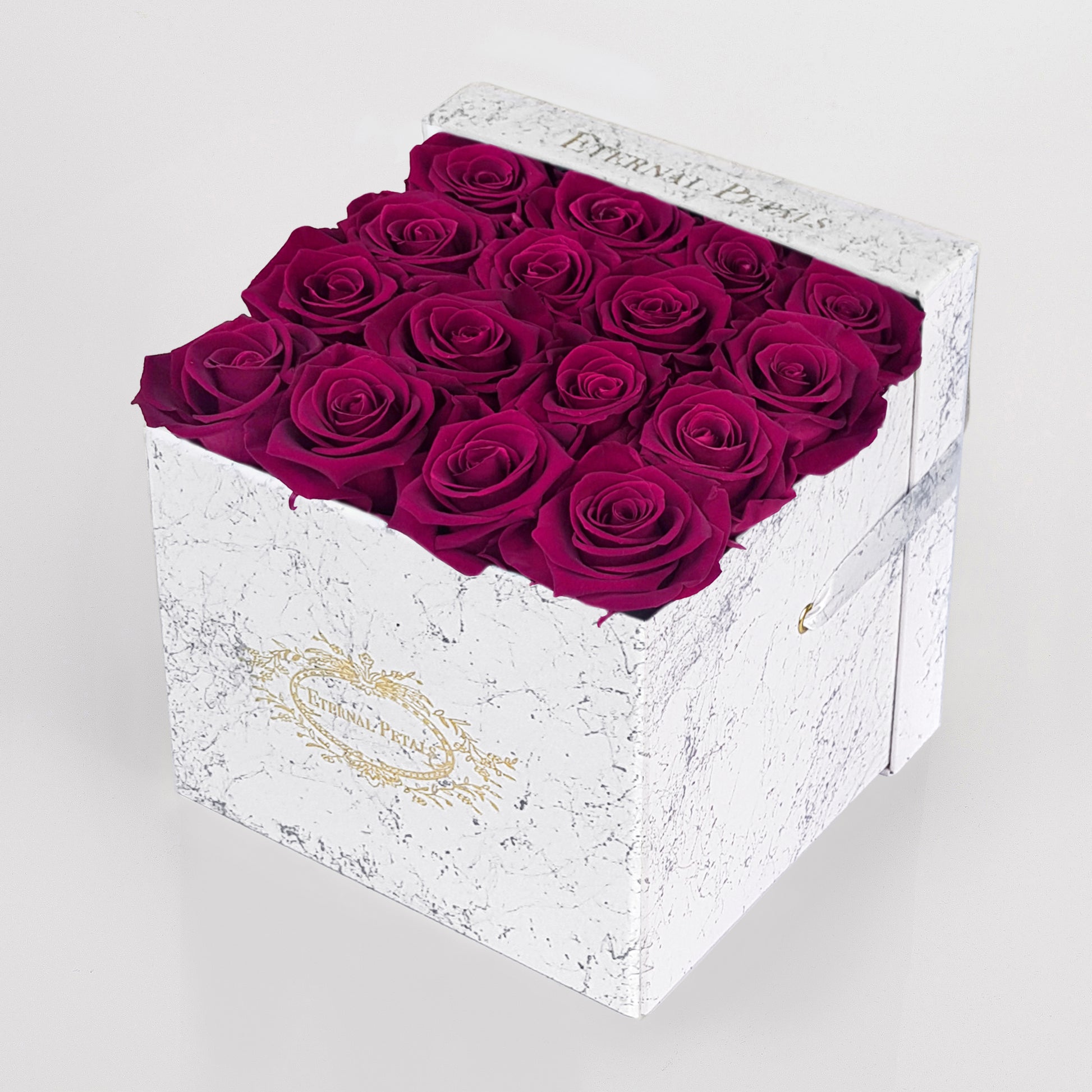 In the pictures you can see Fuchsia colour roses inside our luxury marble box.