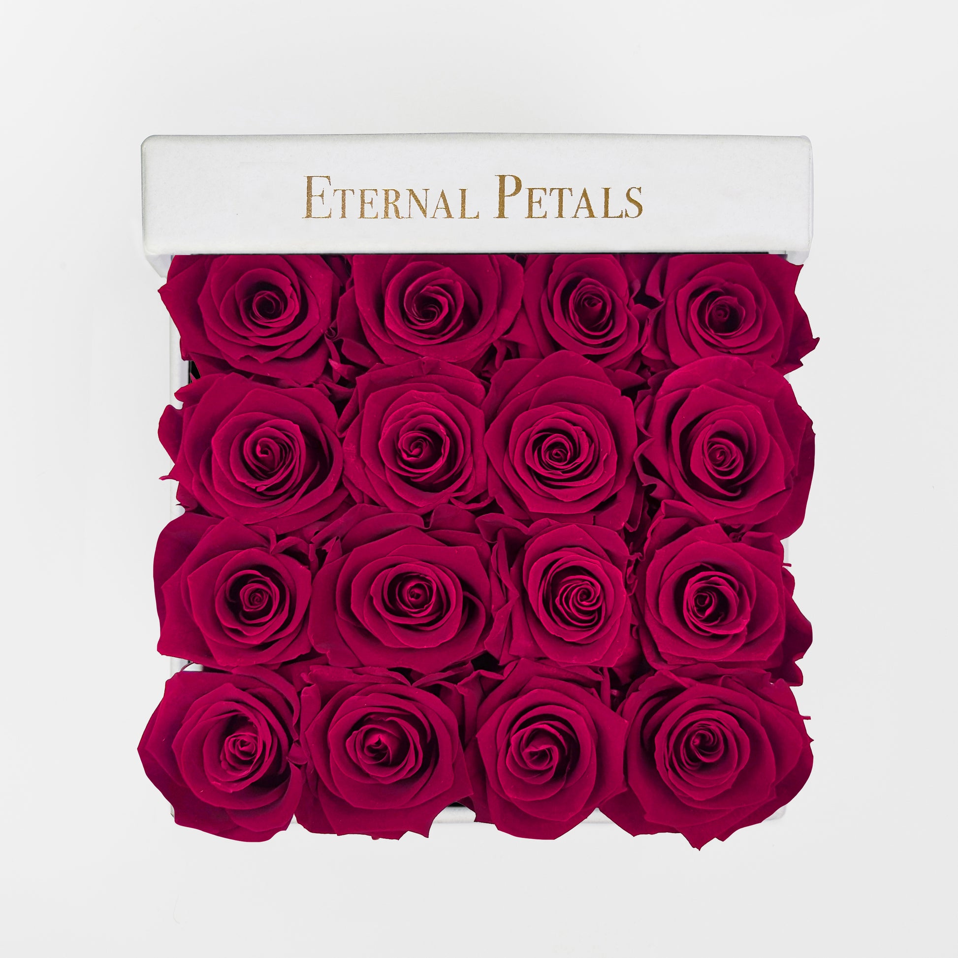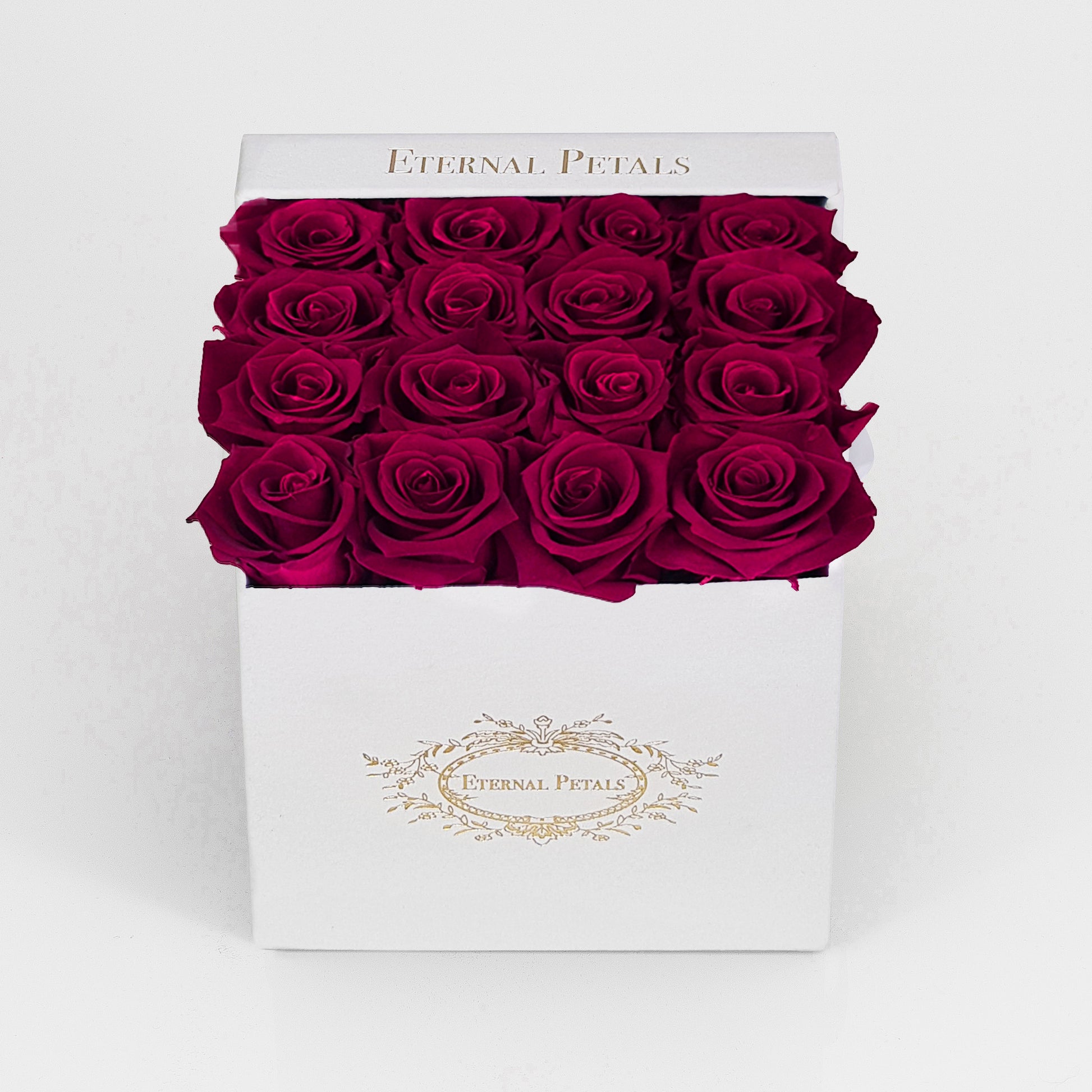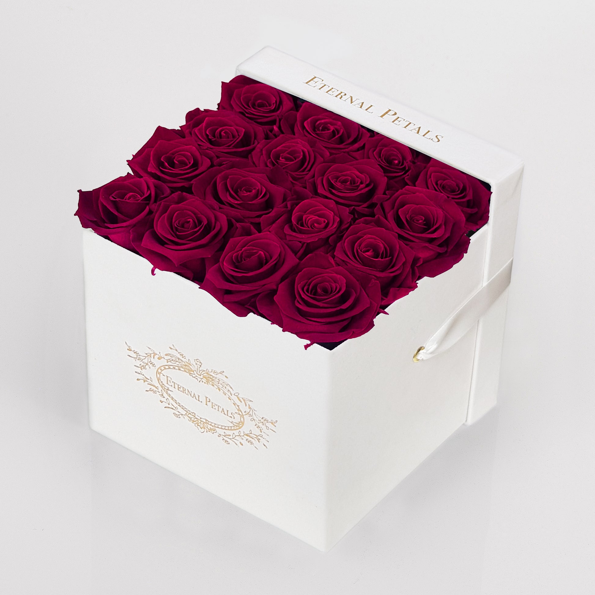 These stunning fuchsia roses peek romantically out of their beautiful white flower box, creating a luxurious bold finish. A warm and rich alternative to a red rose, the deep fuchsia tones are sumptuous and unique, perfect to pair in an elegant and contemporary home or for a sweet token of love. The perfect gift!