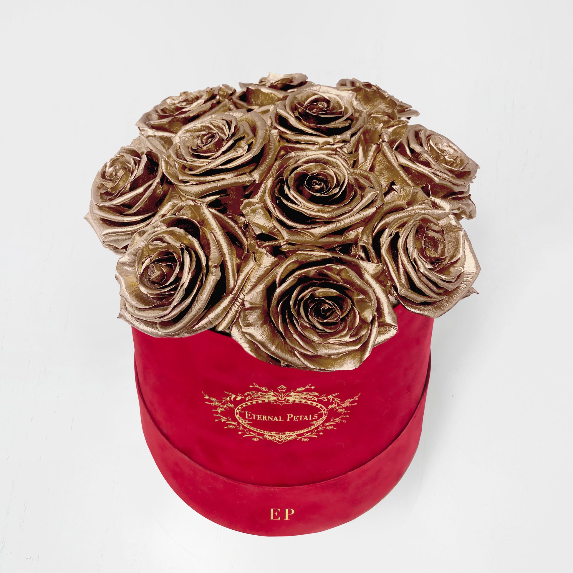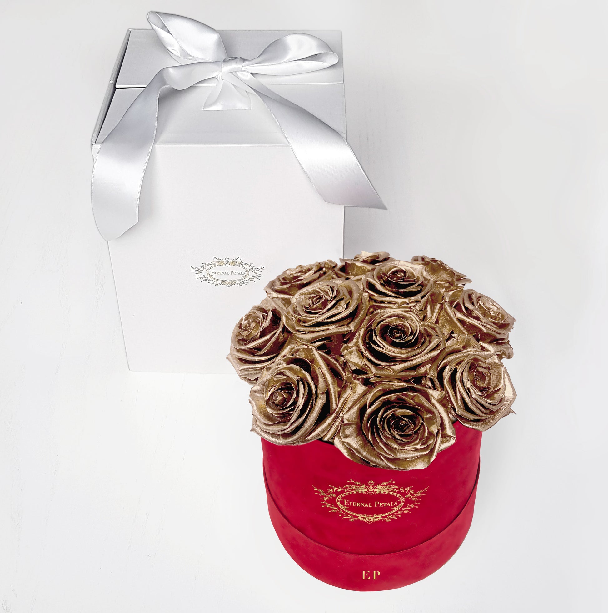 In the pictures you can see a Gold colour rose inside our elegant round box.