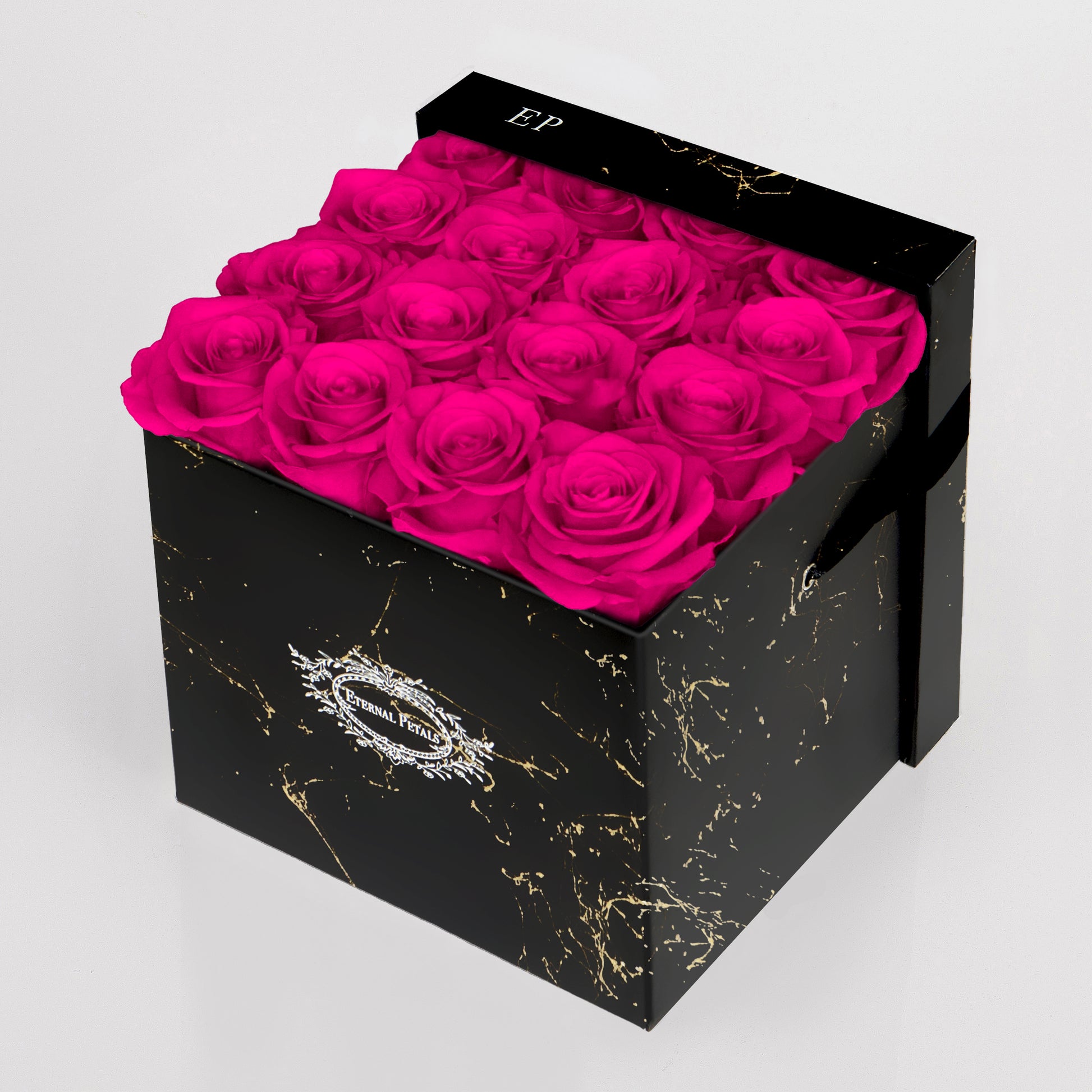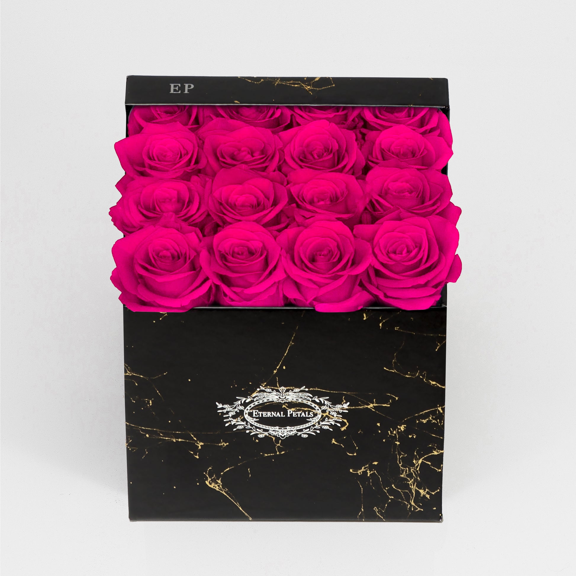 Sitting neatly inside a luxuriously divine marble display box, you will find the most magically enchanting hot pink roses. With an unbelievably bright and vivid pigment, this colour creates a stunning effect on these beautiful flowers and brings a dash of pure romance to the ultimate gift of flowers.