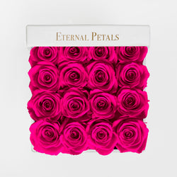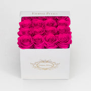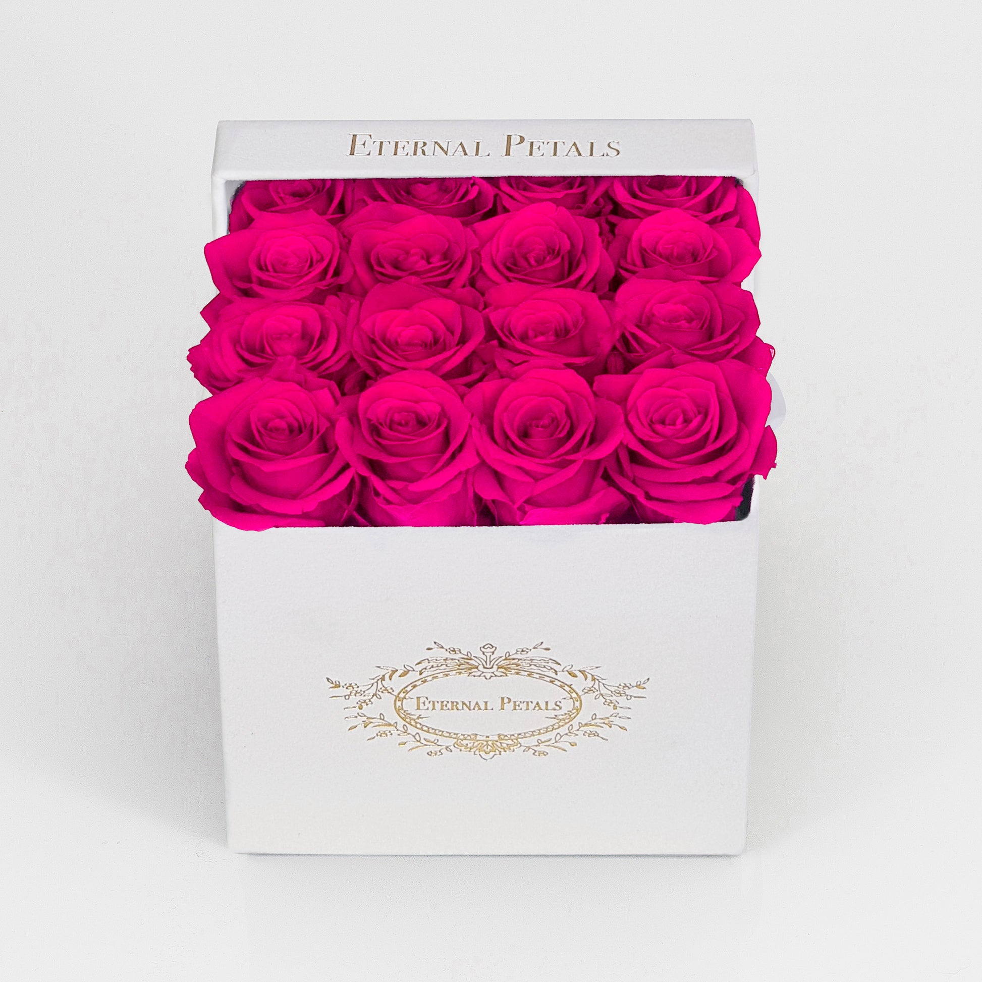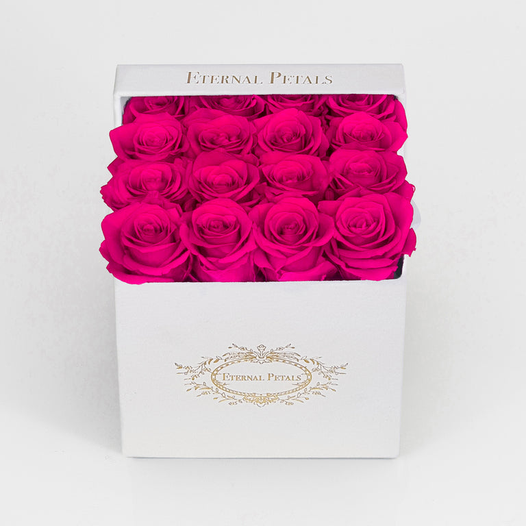 Sitting neatly inside a luxuriously divine white flower box, you will find the most magically enchanting hot pink roses. With an unbelievably bright and vivid pigment, this colour creates a stunning effect on these beautiful flowers and brings a dash of pure romance to the ultimate gift of flowers.