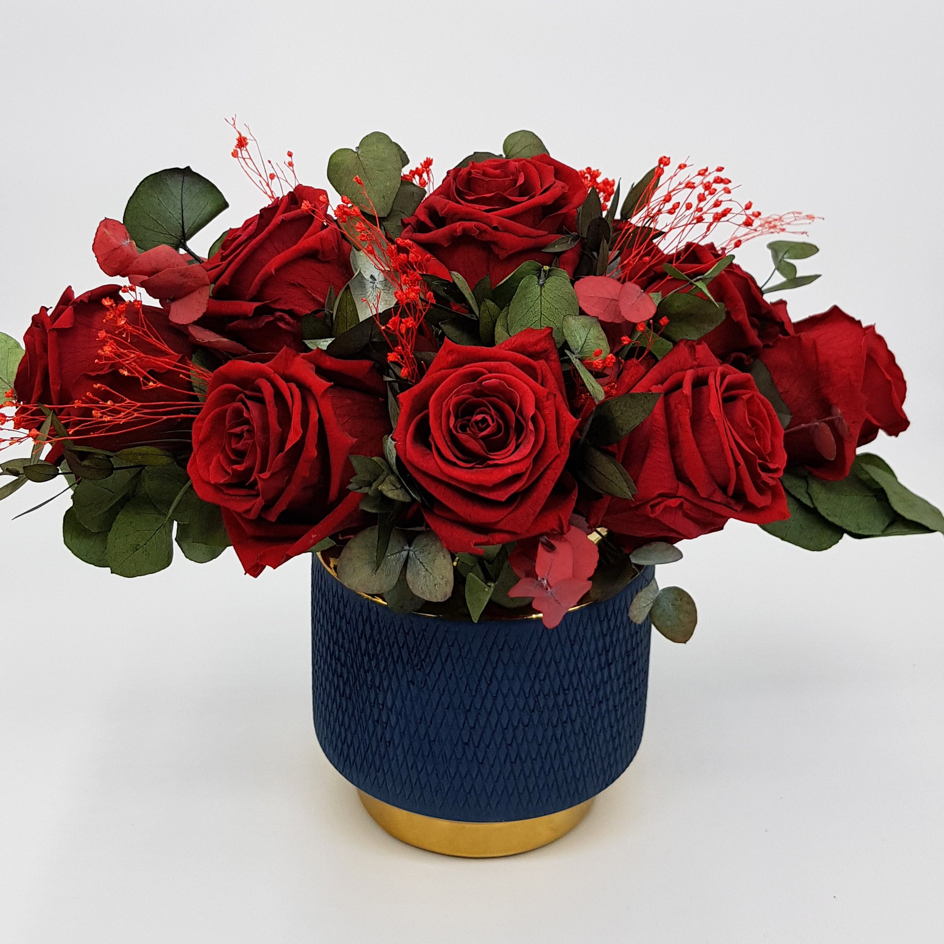 Arriving in a blue ceramic vase, you’ll find perfectly bloomed cherry deep red roses combined with mixed foliage. This beautiful bouquet is the ultimate representation of eternal love and beauty, which you can enjoy and admire for an entire year.