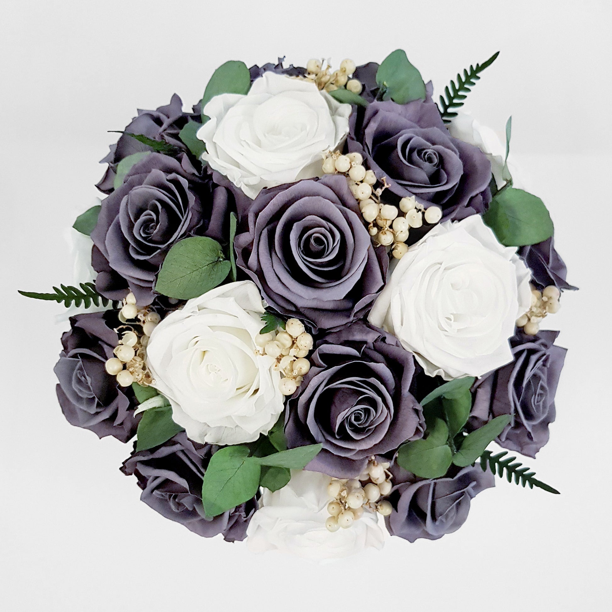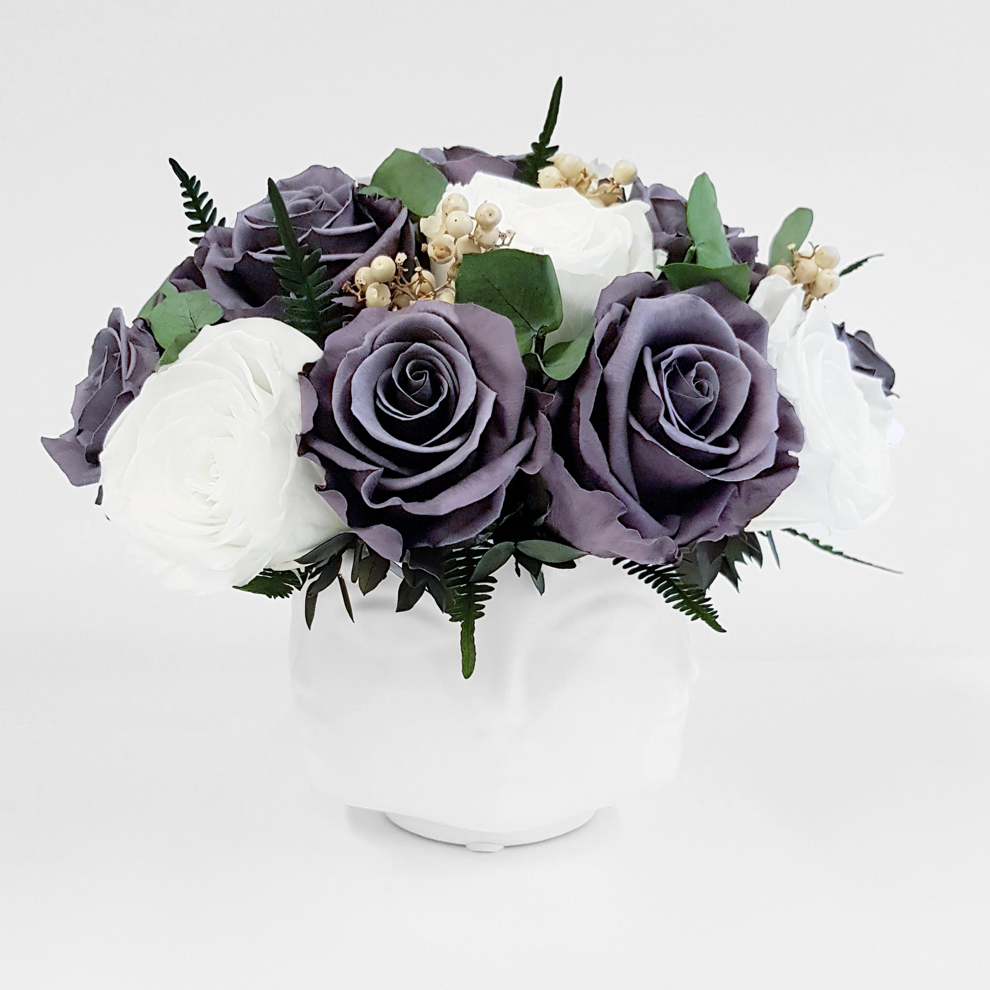 Arriving in a white ceramic vase, you’ll find perfectly bloomed purple slate and white roses combined with mixed foliage. This beautiful bouquet is the ultimate representation of eternal love and beauty, which you can enjoy and admire for an entire year.