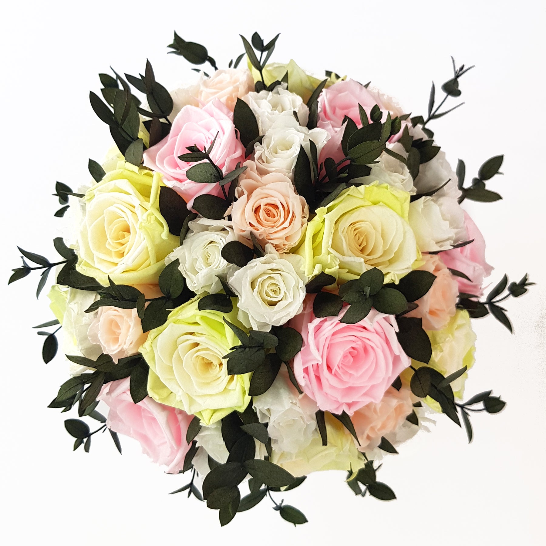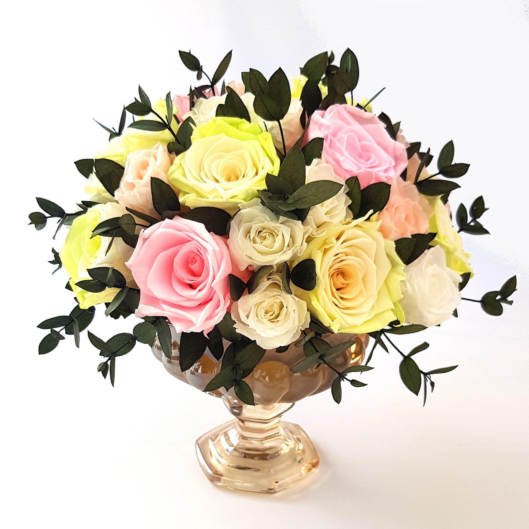 Arriving in a crystal vase, you’ll find perfectly bloomed pink, yellow, peach, white roses combined with mixed leaves and greenery. This beautiful bouquet is the ultimate representation of eternal love and beauty, which you can enjoy and admire for an entire year.