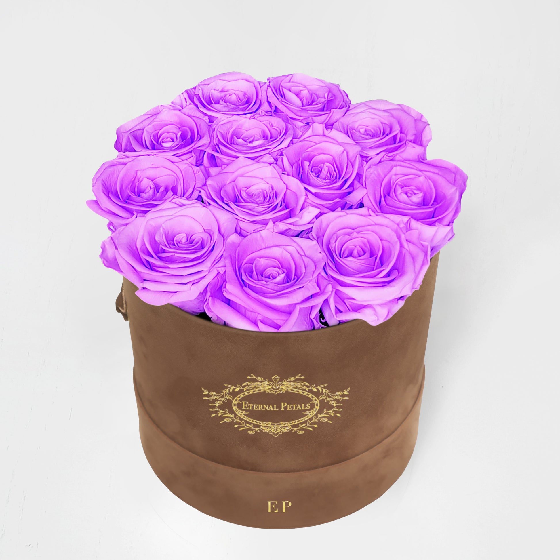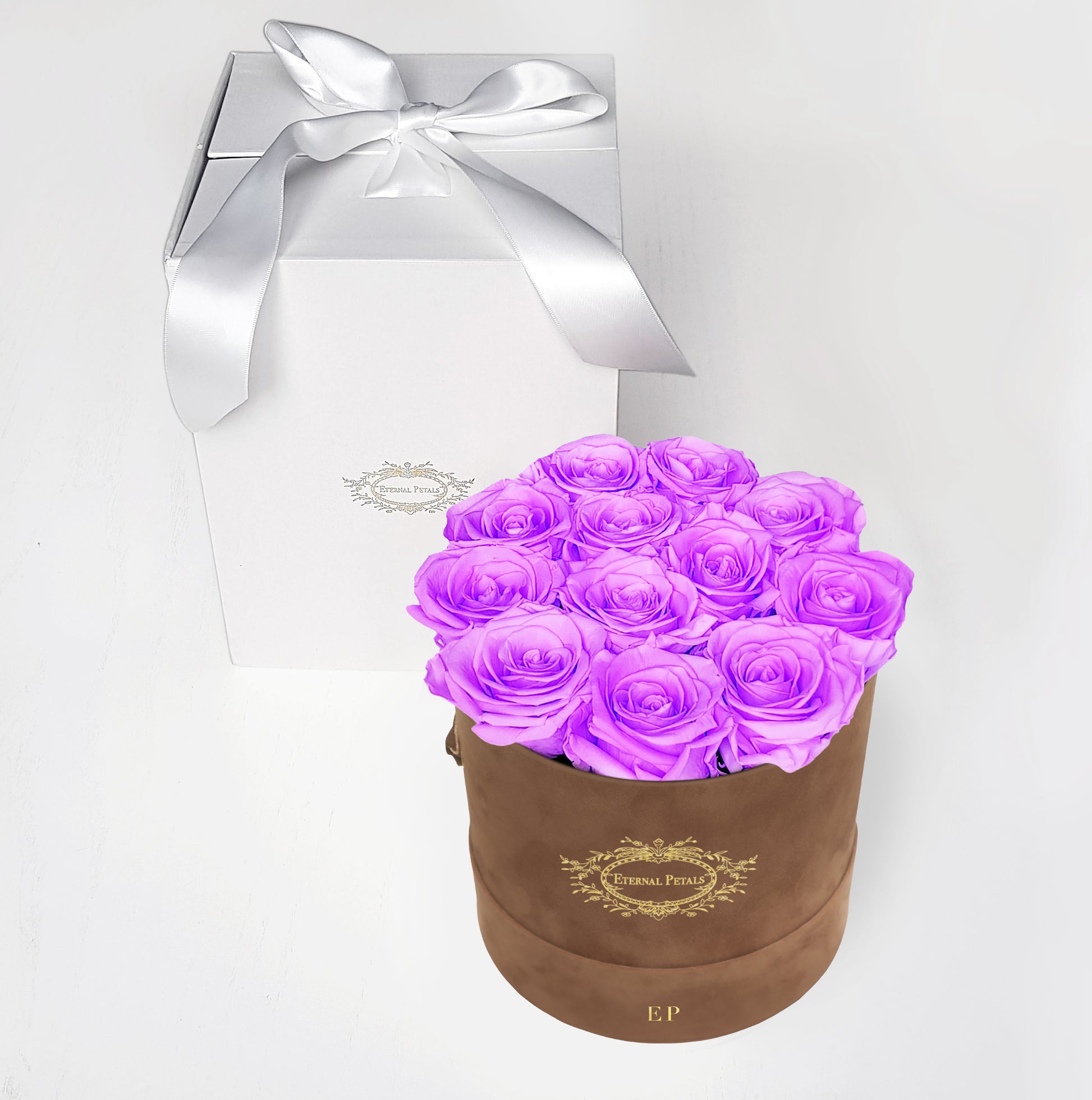 Arriving in this stunning brown gift box, you’ll find 11-14 perfectly bloomed, real roses in authentically beautiful luscious lilac colour. The ultimate in classic romance, which you can enjoy and admire for a whole year.