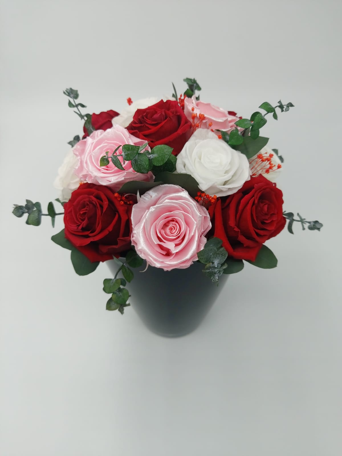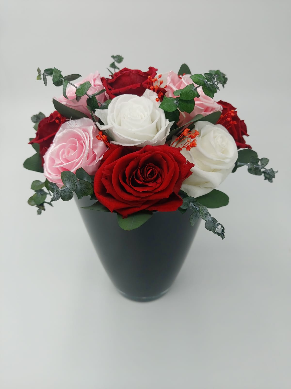 Arriving in a black ceramic vase, you’ll find perfectly bloomed deep red, pink satin and white roses combined with mixed foliage. This beautiful bouquet is the ultimate representation of eternal love and beauty, which you can enjoy and admire for an entire year.