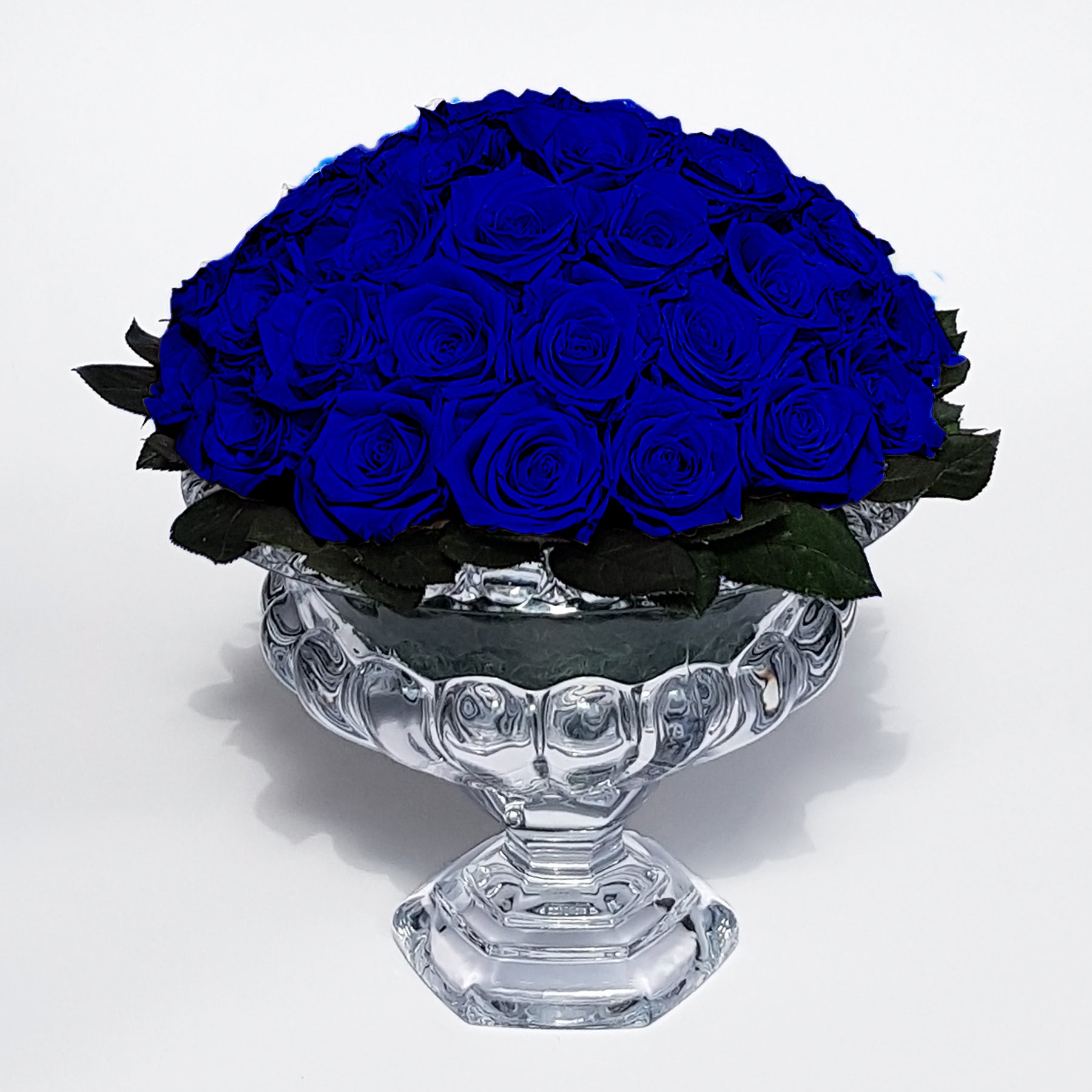 Arriving in this stunning German crystal vase, you’ll find 45-50 perfectly bloomed, real roses in authentically beautiful, deep blue. The ultimate in classic romance, the blue rose defies nature with its strikingly magical blue pigment, which you can enjoy and admire for a whole year.
