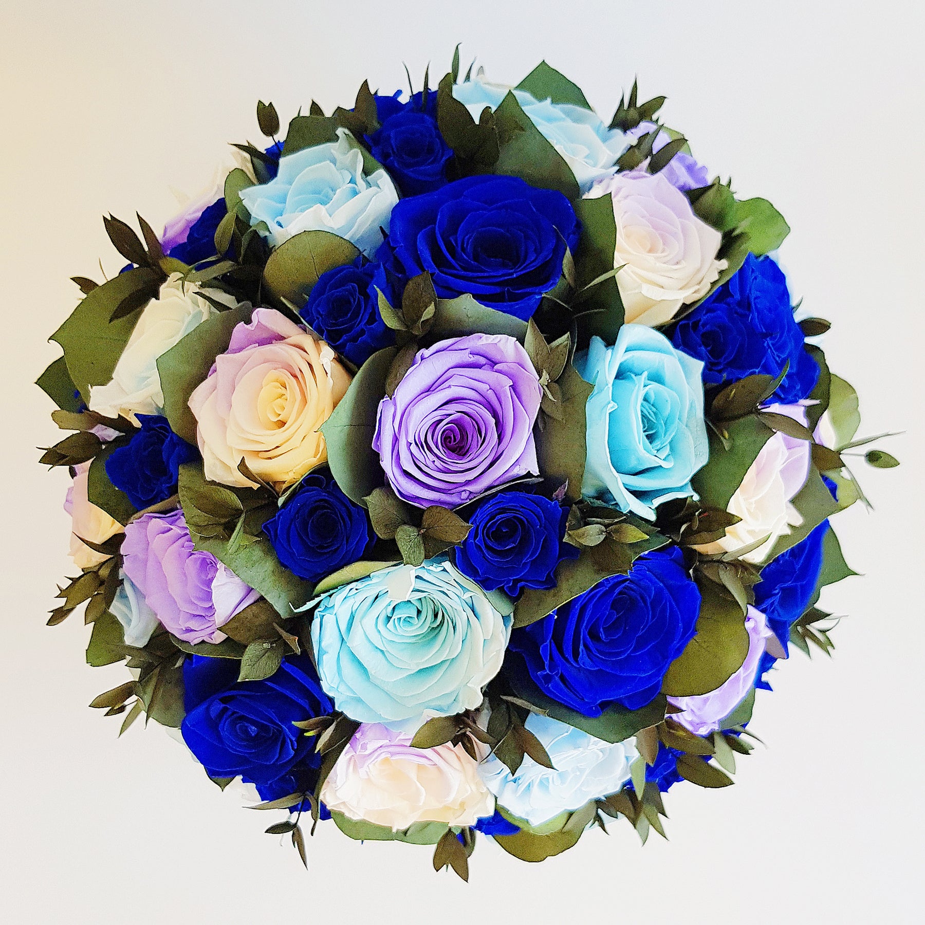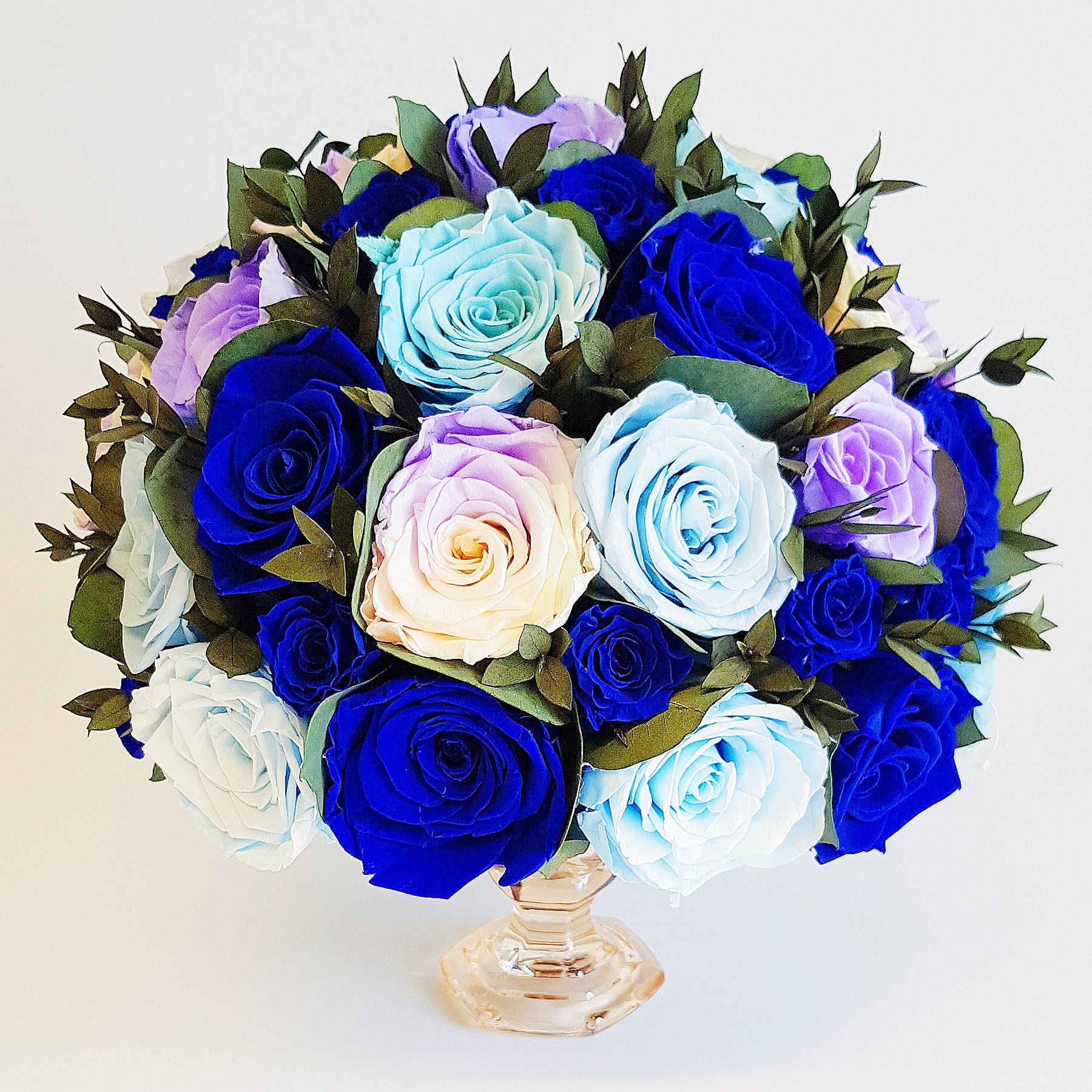 Arriving in a crystal vase, you’ll find perfectly bloomed roses combined with mixed leaves and greenery. This beautiful bouquet is the ultimate representation of eternal love and beauty, which you can enjoy and admire for an entire year.