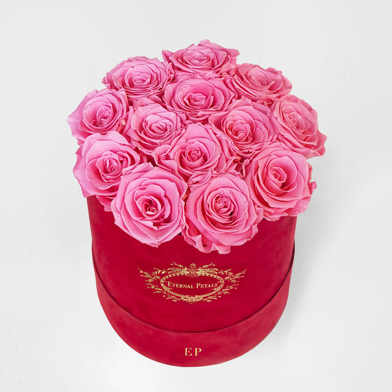 These stunning pink roses peek romantically out of their beautiful classic round box, creating a luxurious bold finish. A warm and rich tones are sumptuous and unique, perfect to pair in an elegant and contemporary home or for a sweet token of love.