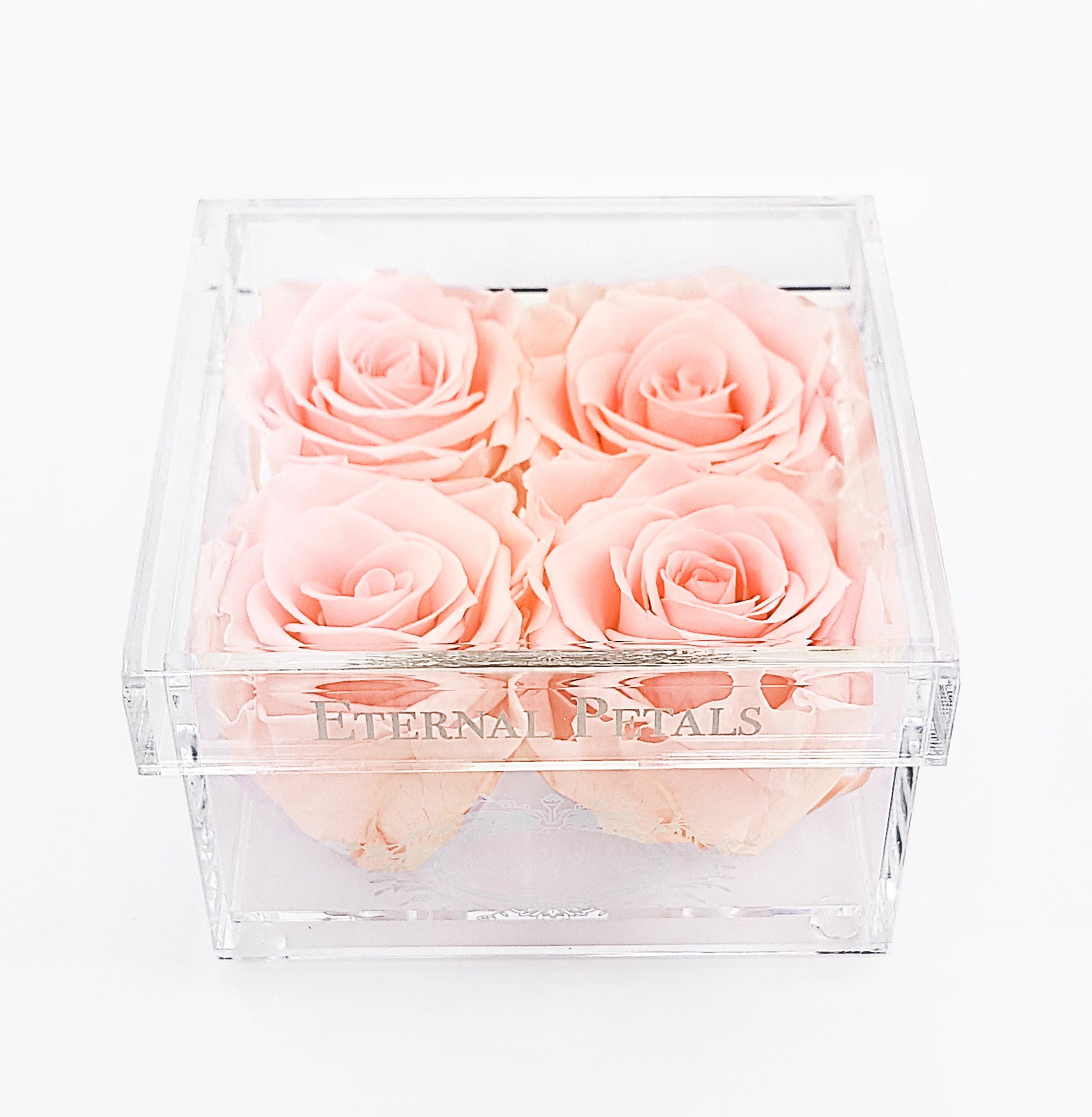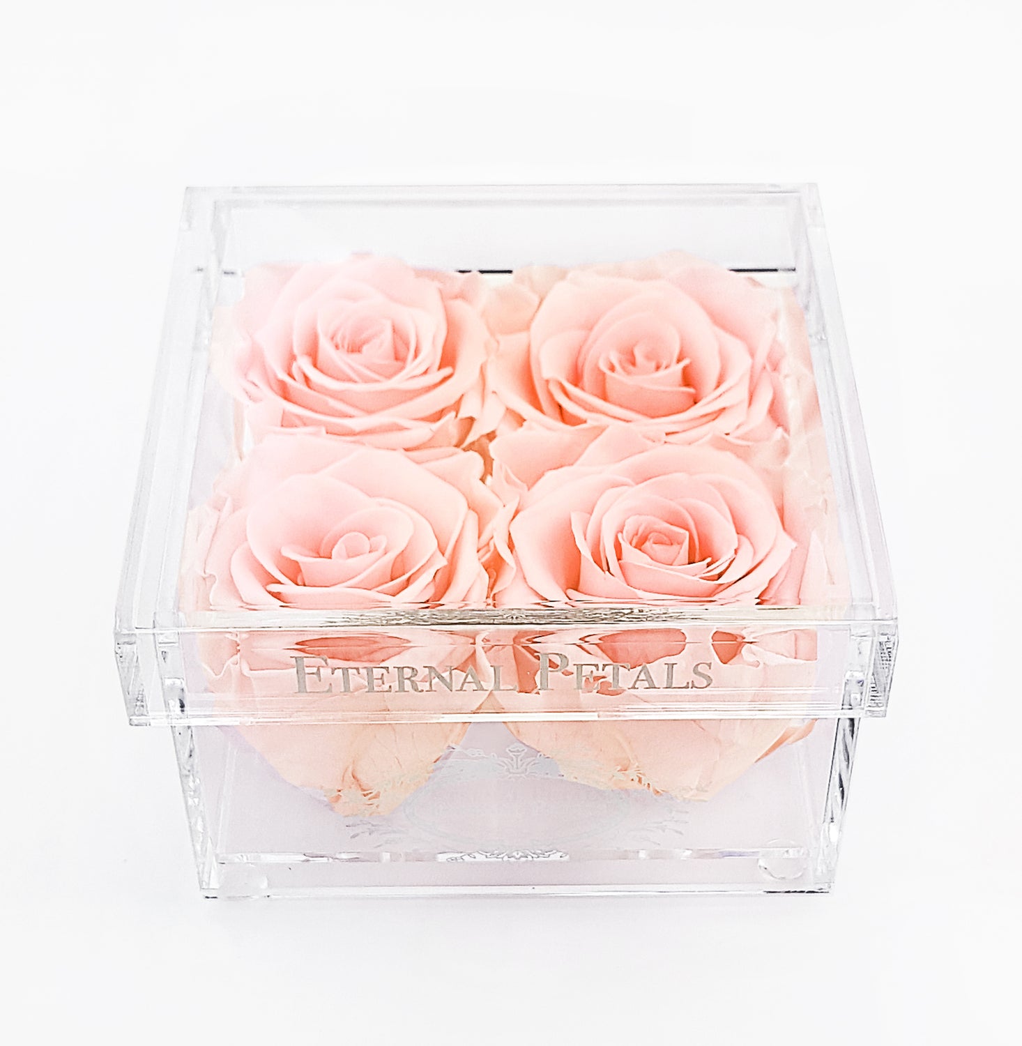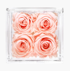 In the pictures you can see four very light pinkish coloured roses inside our trendy acrylic box.