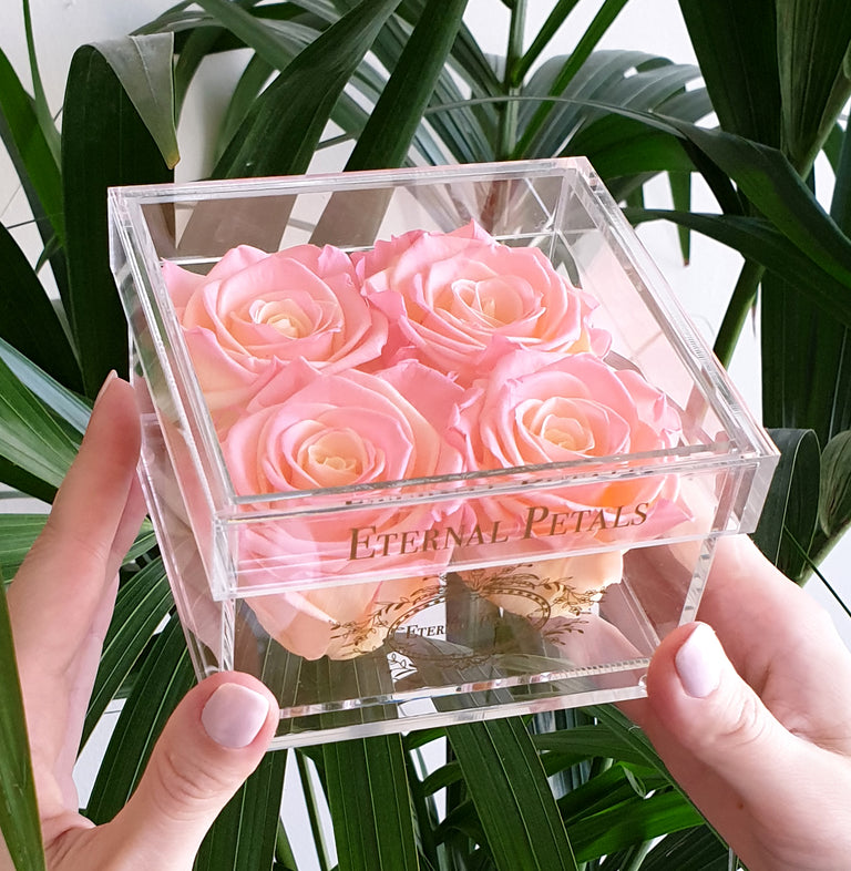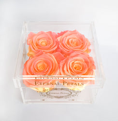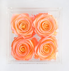 In the pictures you can see four Double Peach colour roses inside our trendy acrylic box.