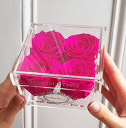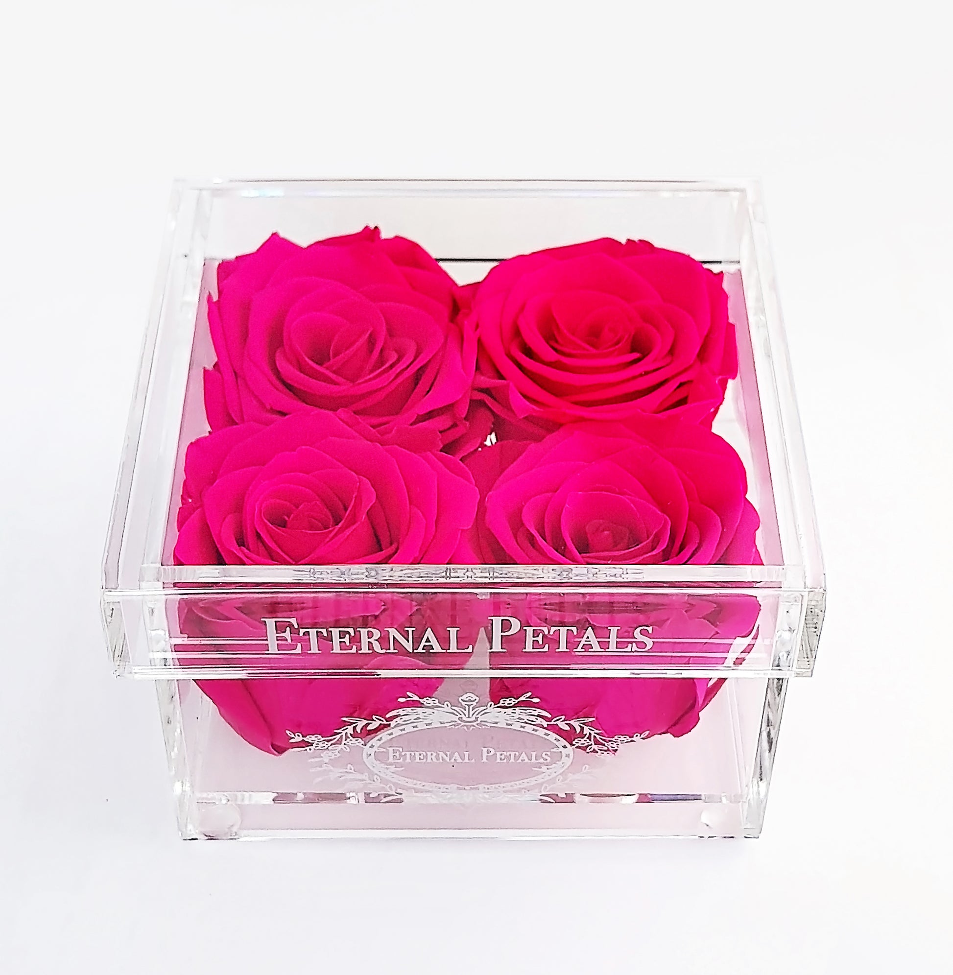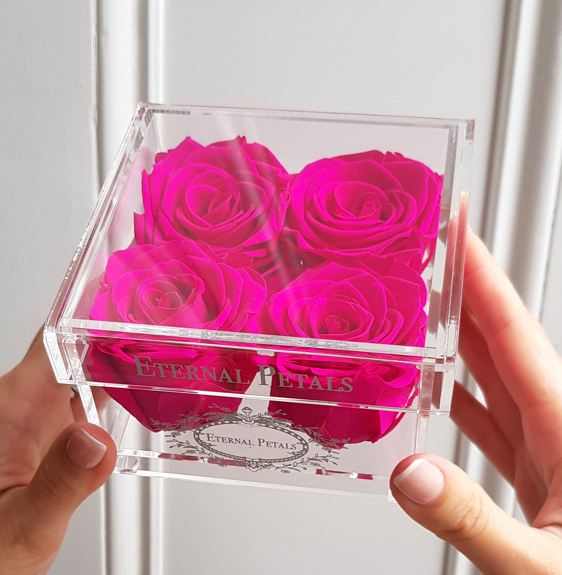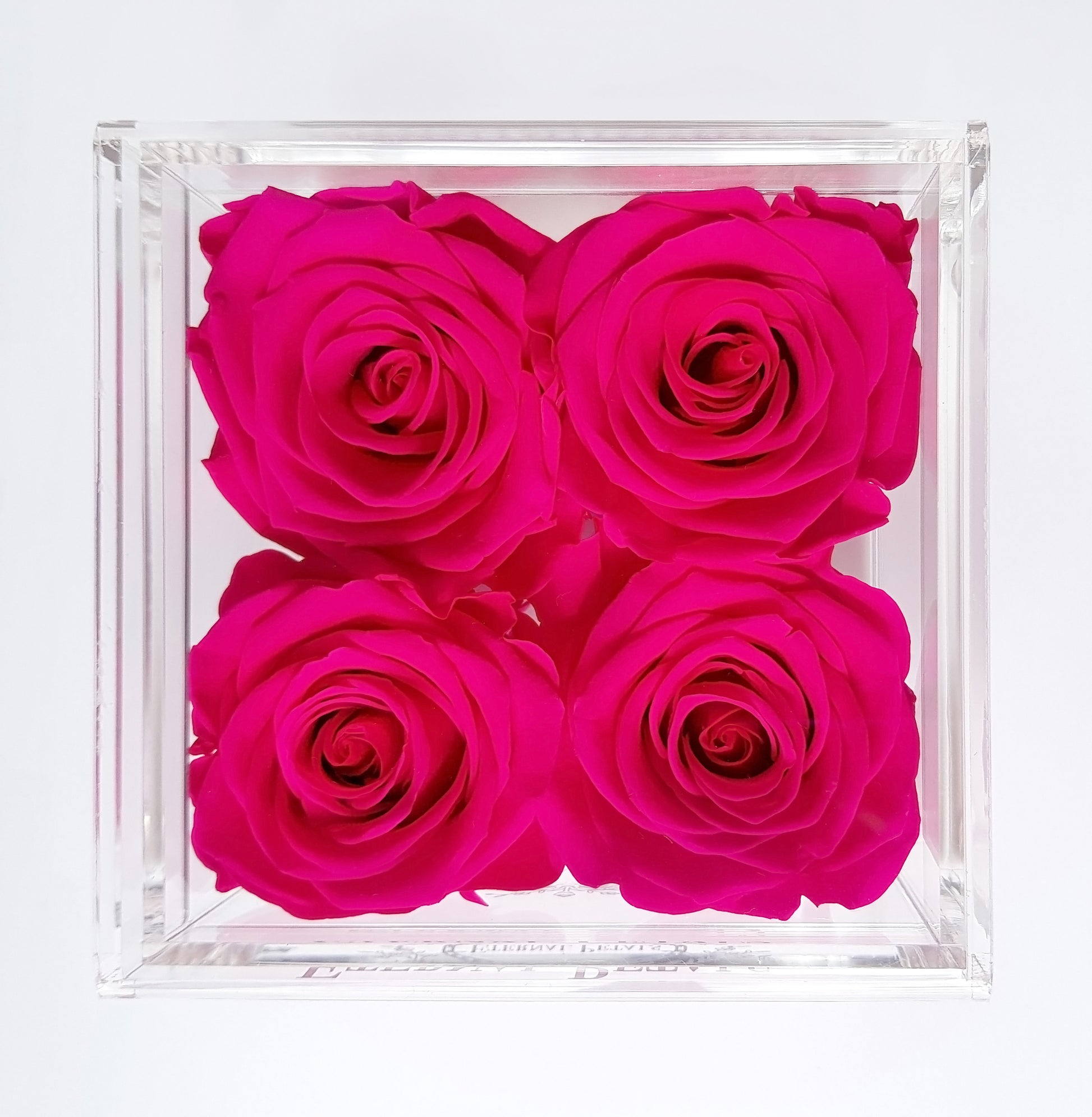 In the pictures you can see four Hot Pink colour roses inside our trendy acrylic box.
