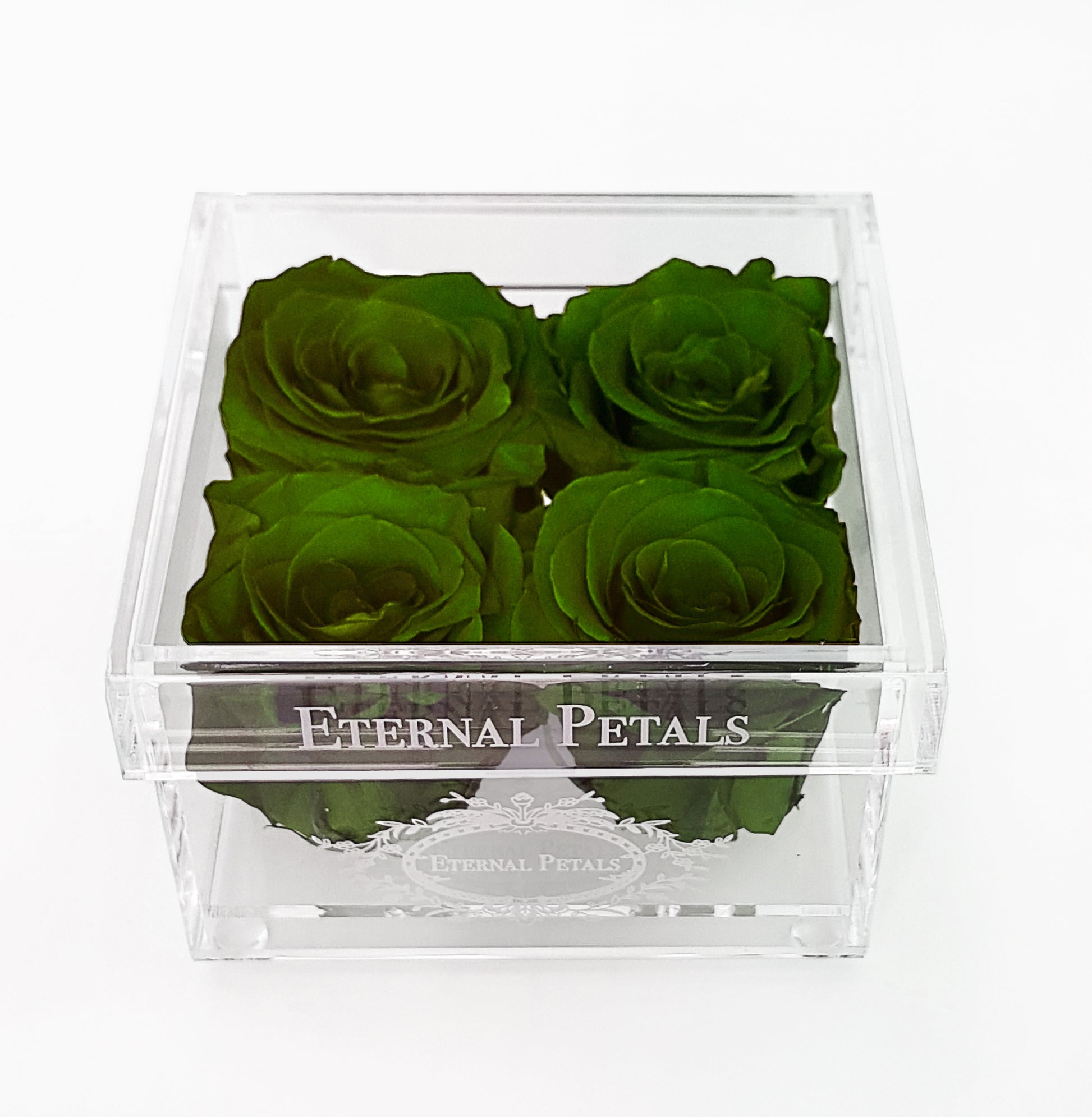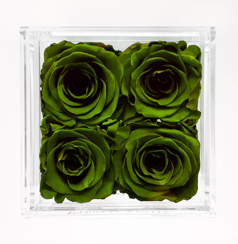In the pictures you can see four Khaki coloured roses inside our trendy acrylic box.