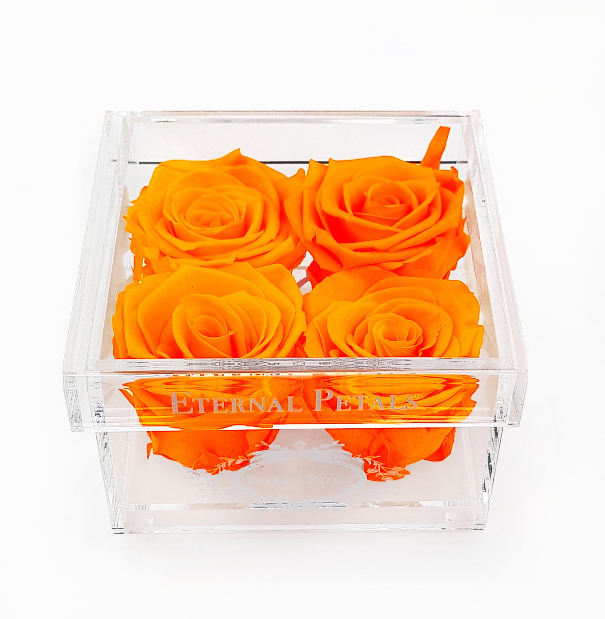 In the pictures you can see four Orange coloured roses inside our trendy acrylic box.