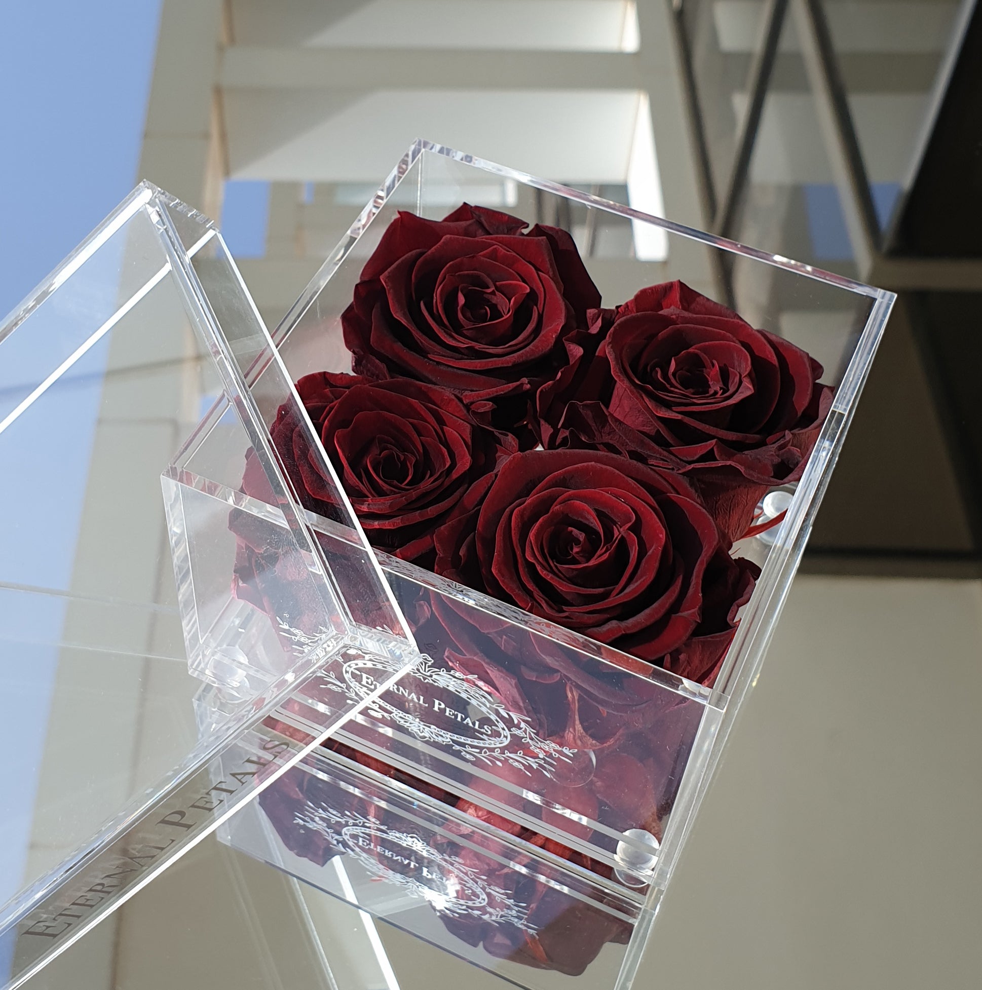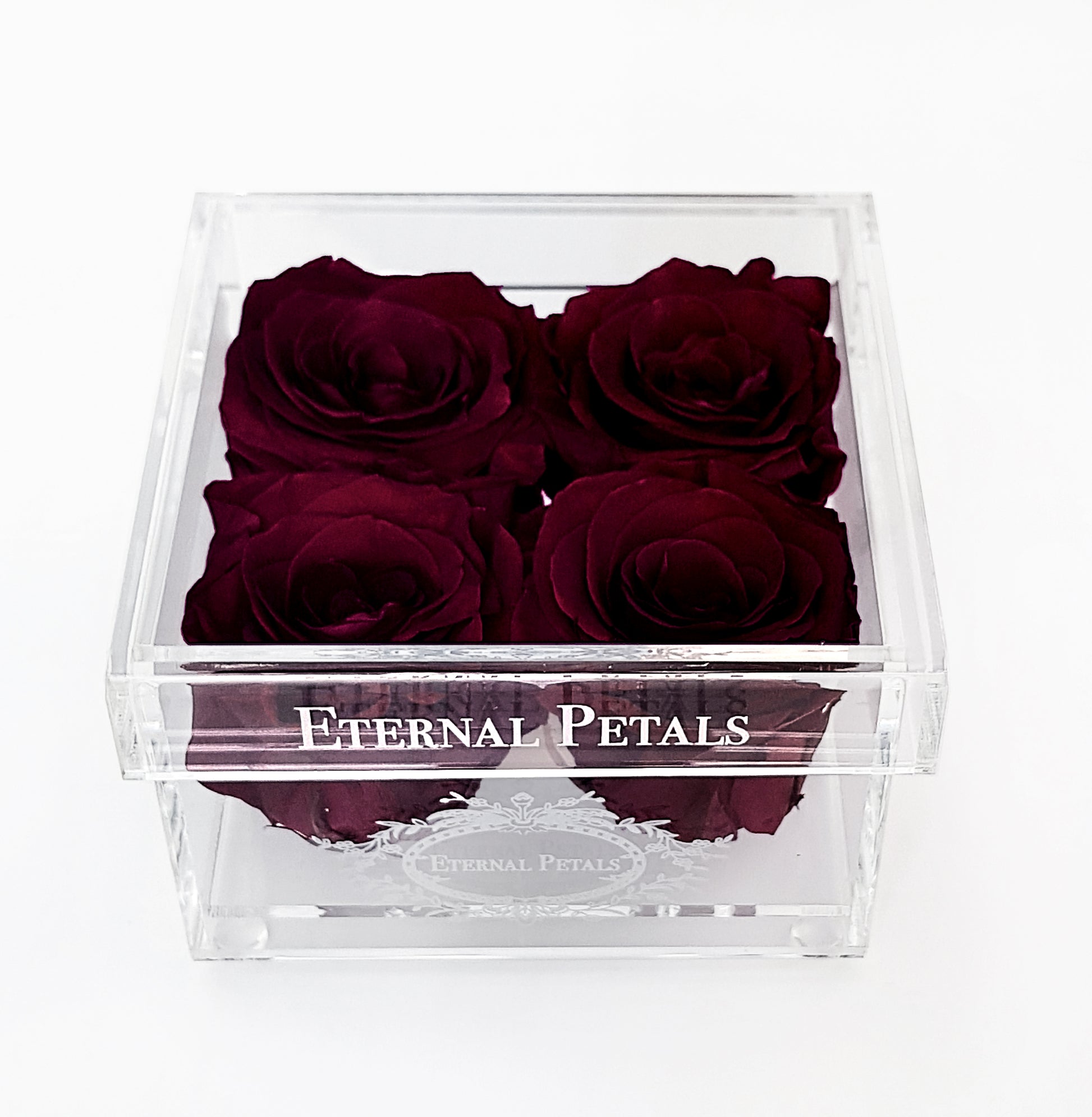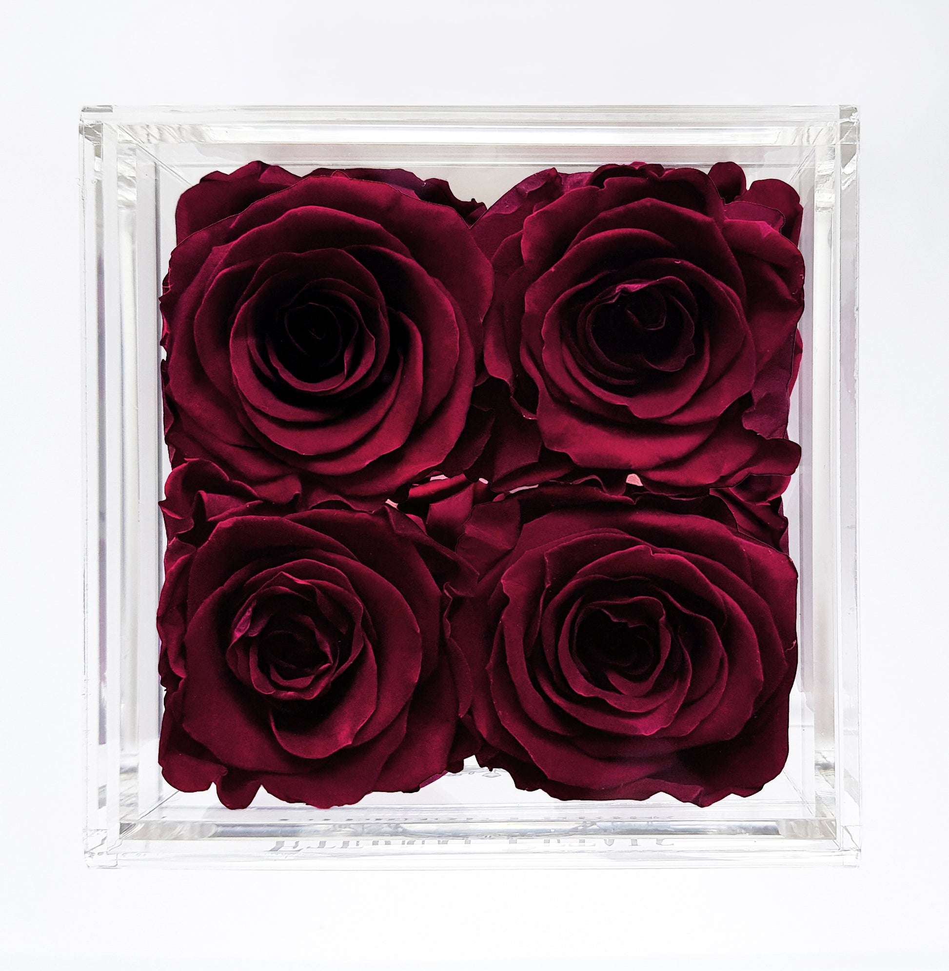 In the pictures you can see four Burgundy coloured roses inside our trendy acrylic box.