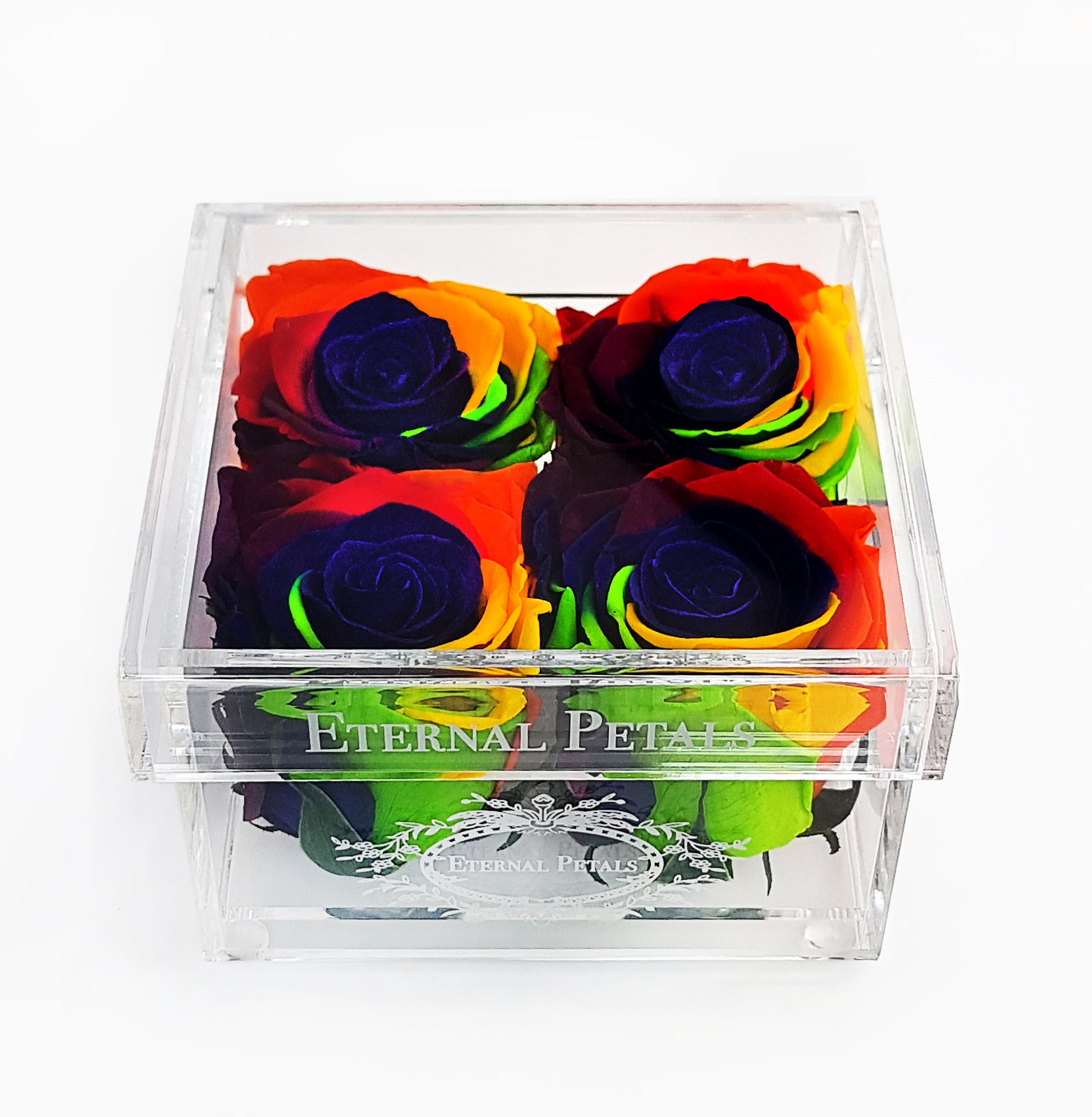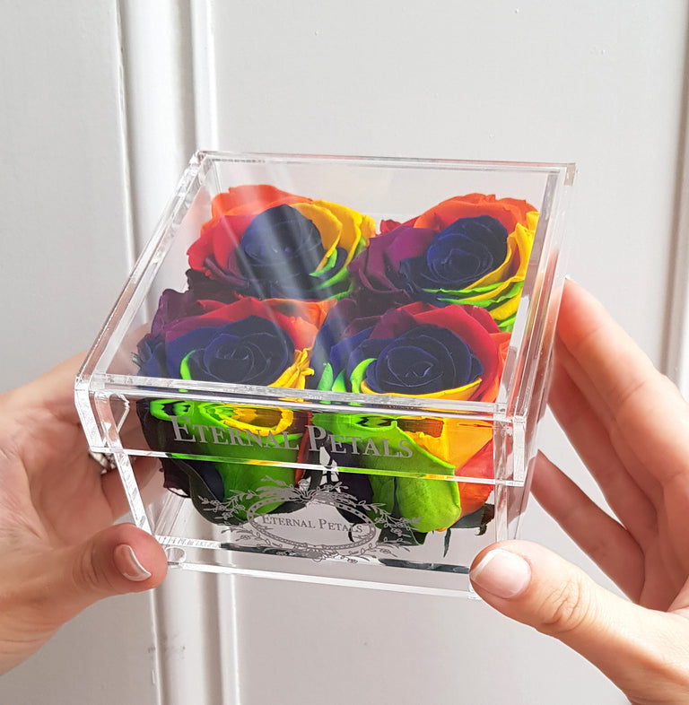 In the pictures you can see four Rainbow colour roses inside our trendy acrylic box.