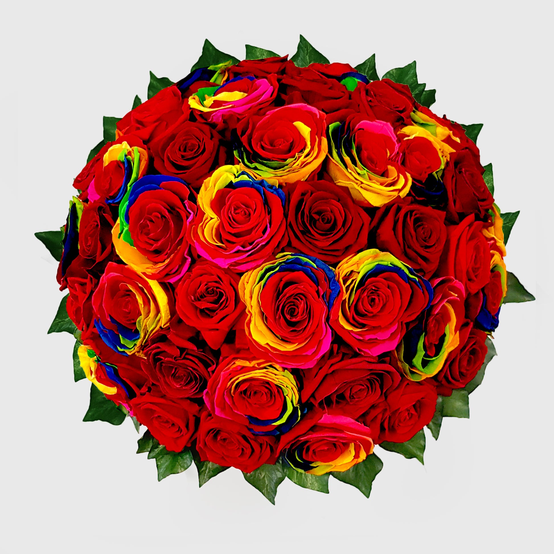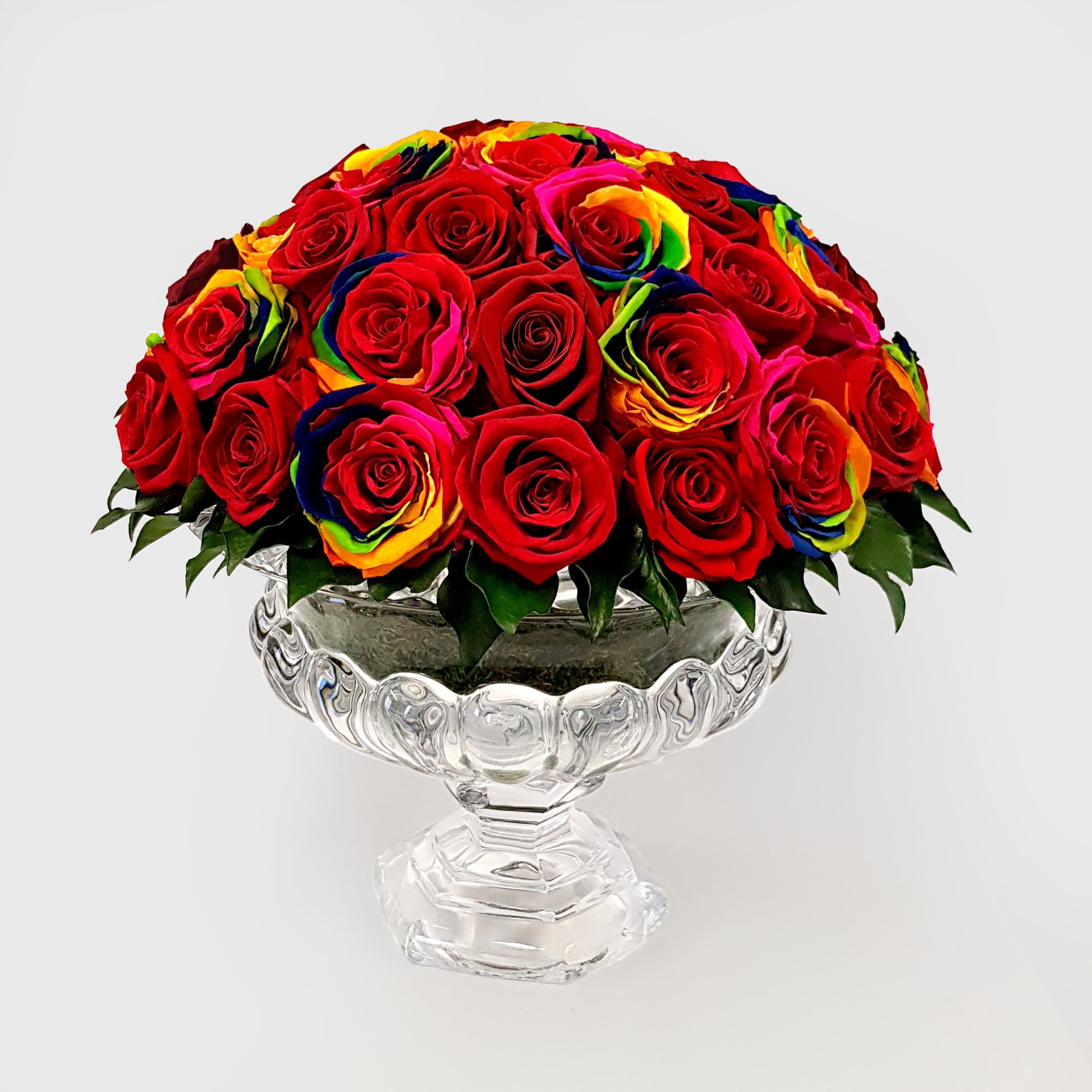 Arriving in this stunning German crystal vase, you’ll find 45-50 perfectly bloomed, real roses in authentically beautiful rainbow roses. The ultimate in classic romance, the red and rainbow rose defies nature with its strikingly magical pigment, which you can enjoy and admire for a whole year.