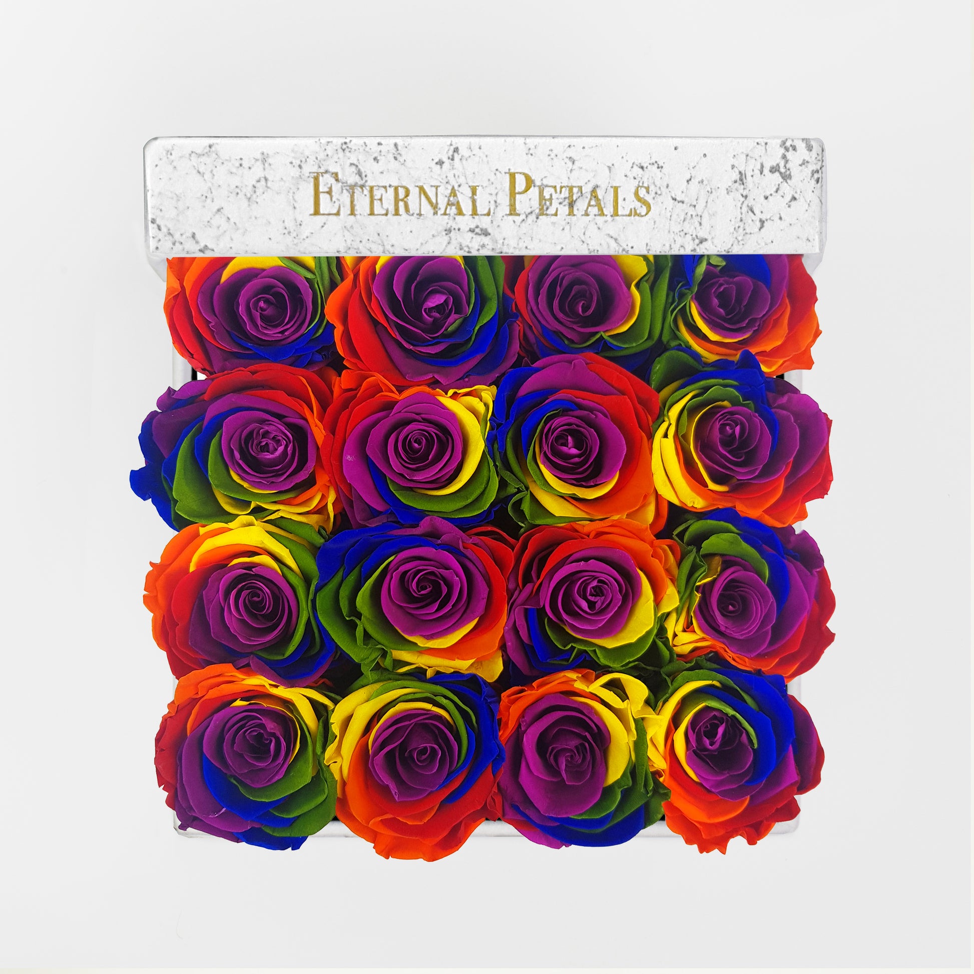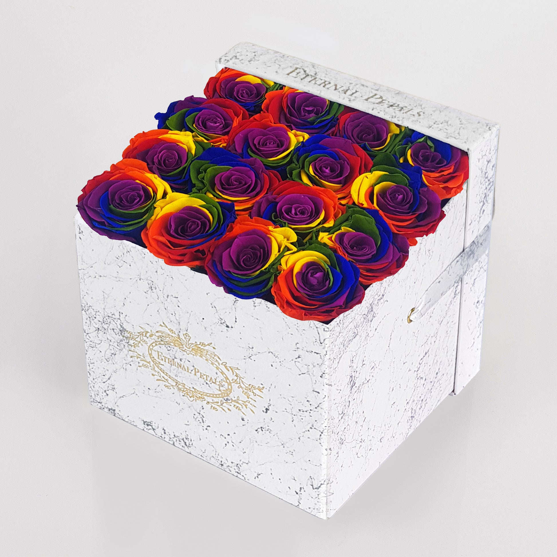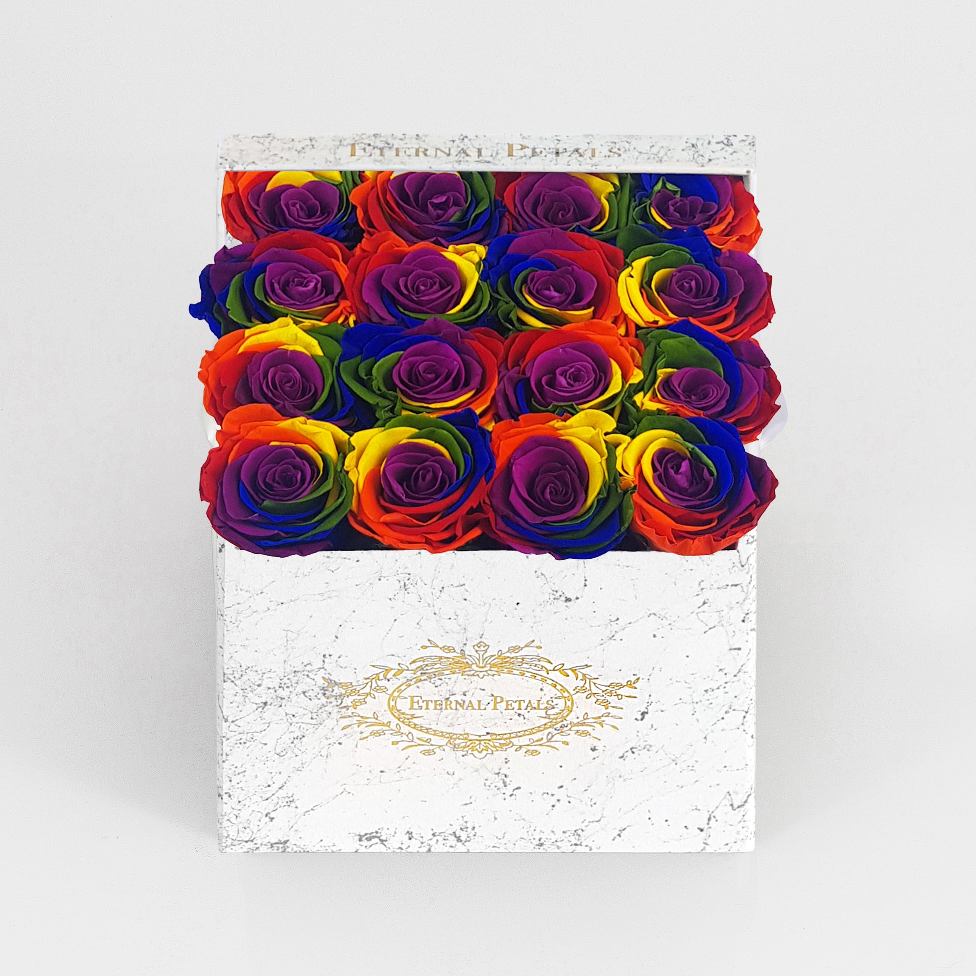 In the pictures you can see rainbow colour roses inside our luxury marble box.