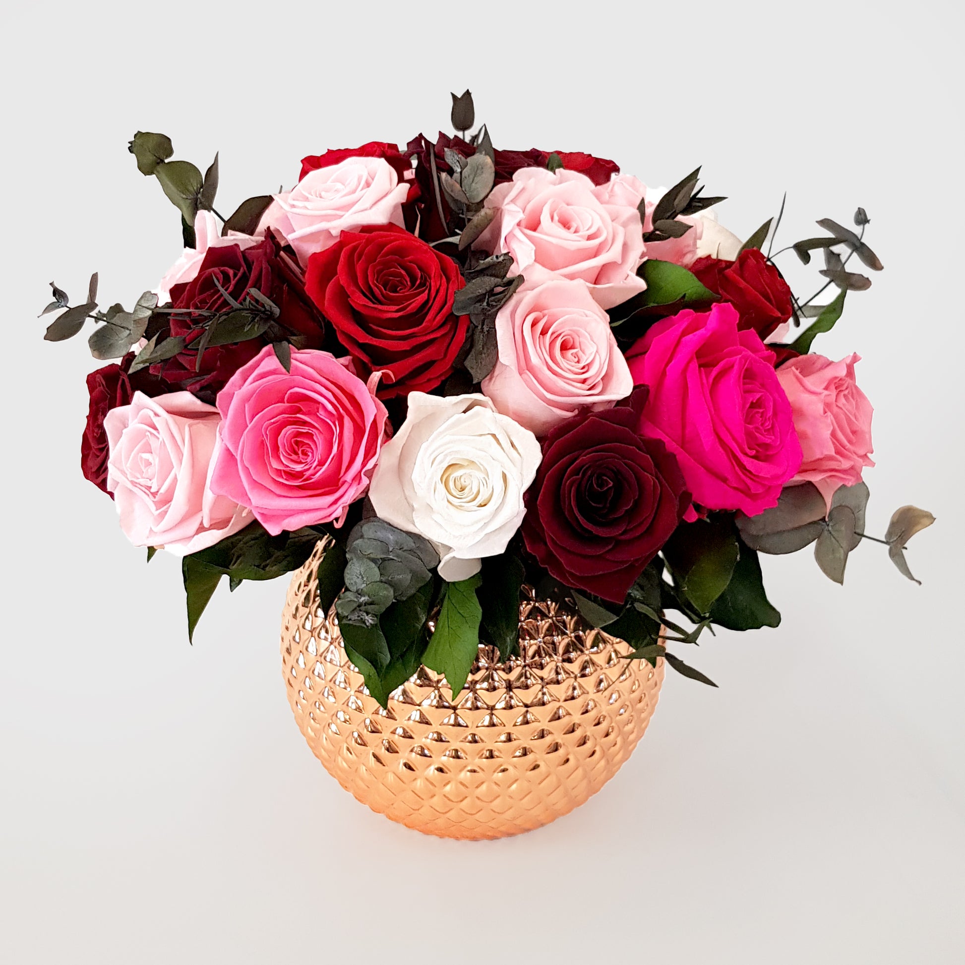 Arriving in a vase, you’ll find perfectly bloomed roses combined with mixed leaves and warm toned roses. This beautiful bouquet is the ultimate representation of eternal love and beauty, which you can enjoy and admire for an entire year.