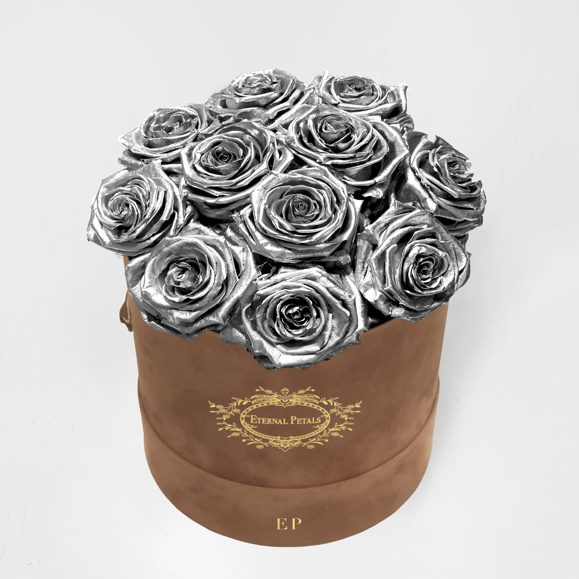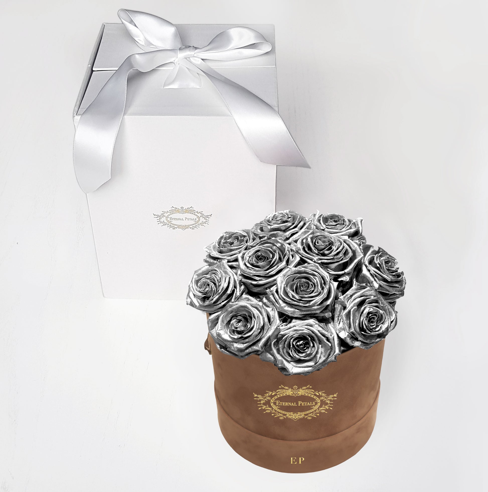 Arriving in this stunning brown gift box, you’ll find 11-14 perfectly bloomed, real roses in authentically beautiful silver colour. The ultimate in classic romance, which you can enjoy and admire for a whole year.