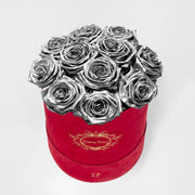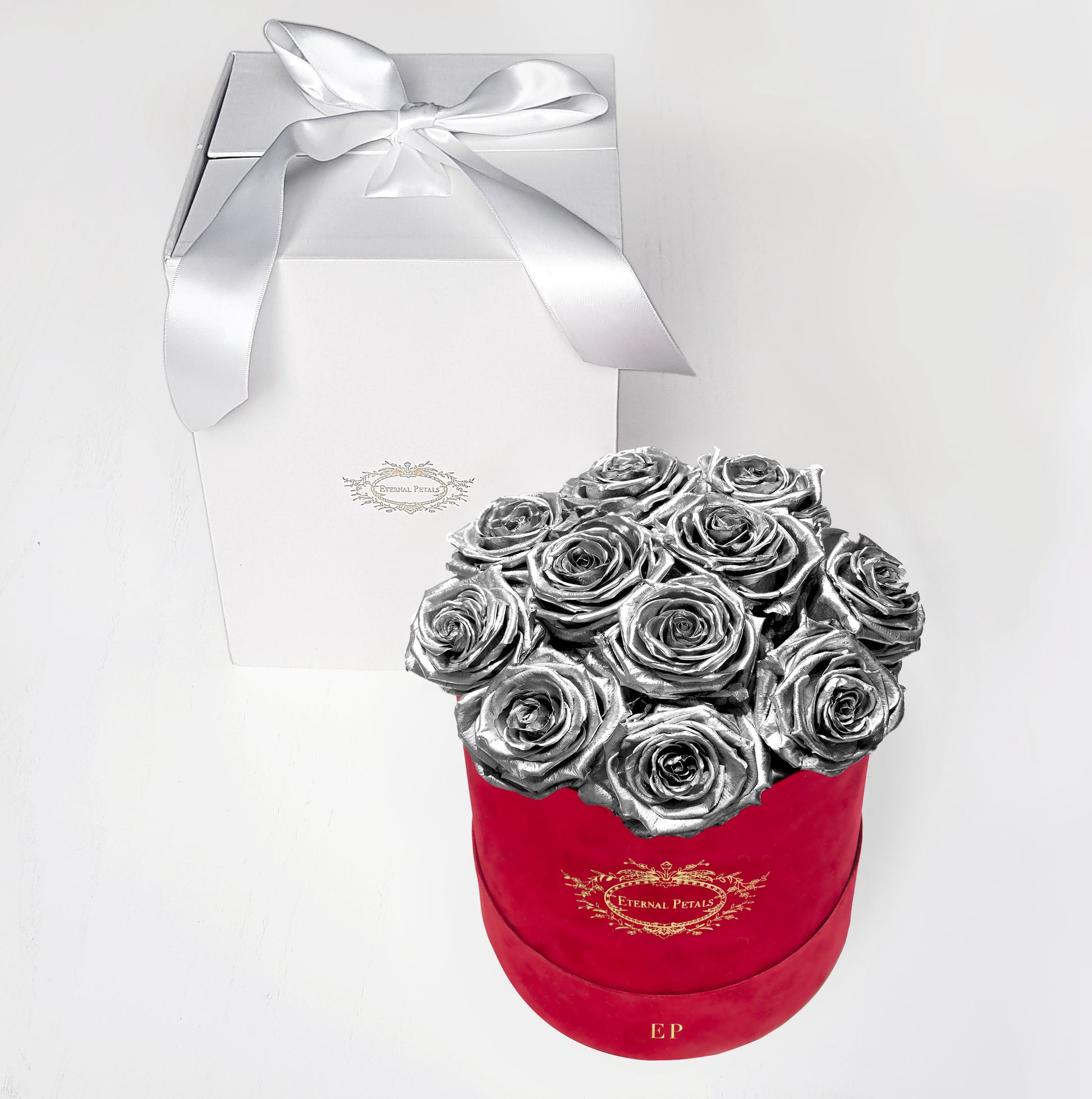 In the pictures you can see a Silver colour rose inside our elegant round box.