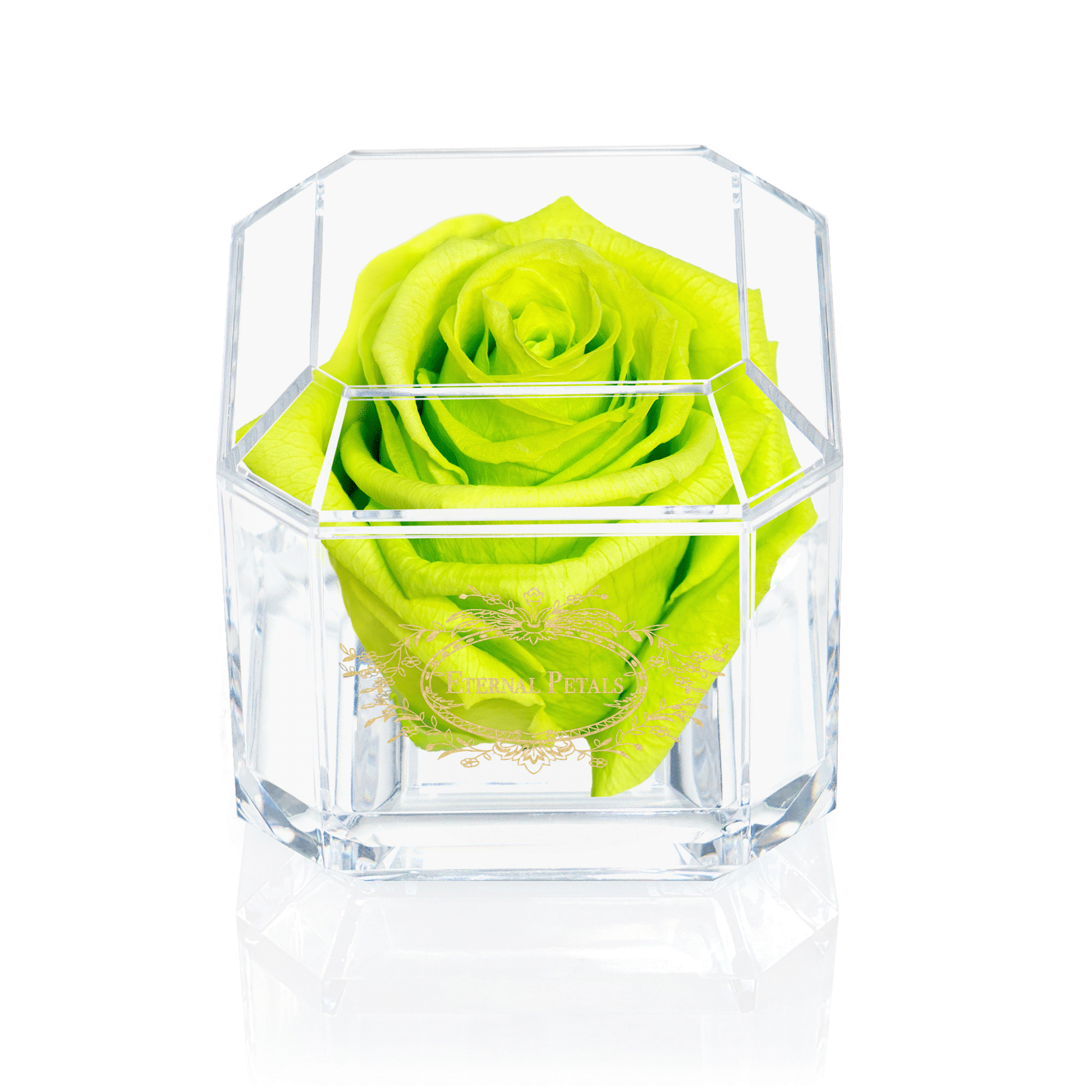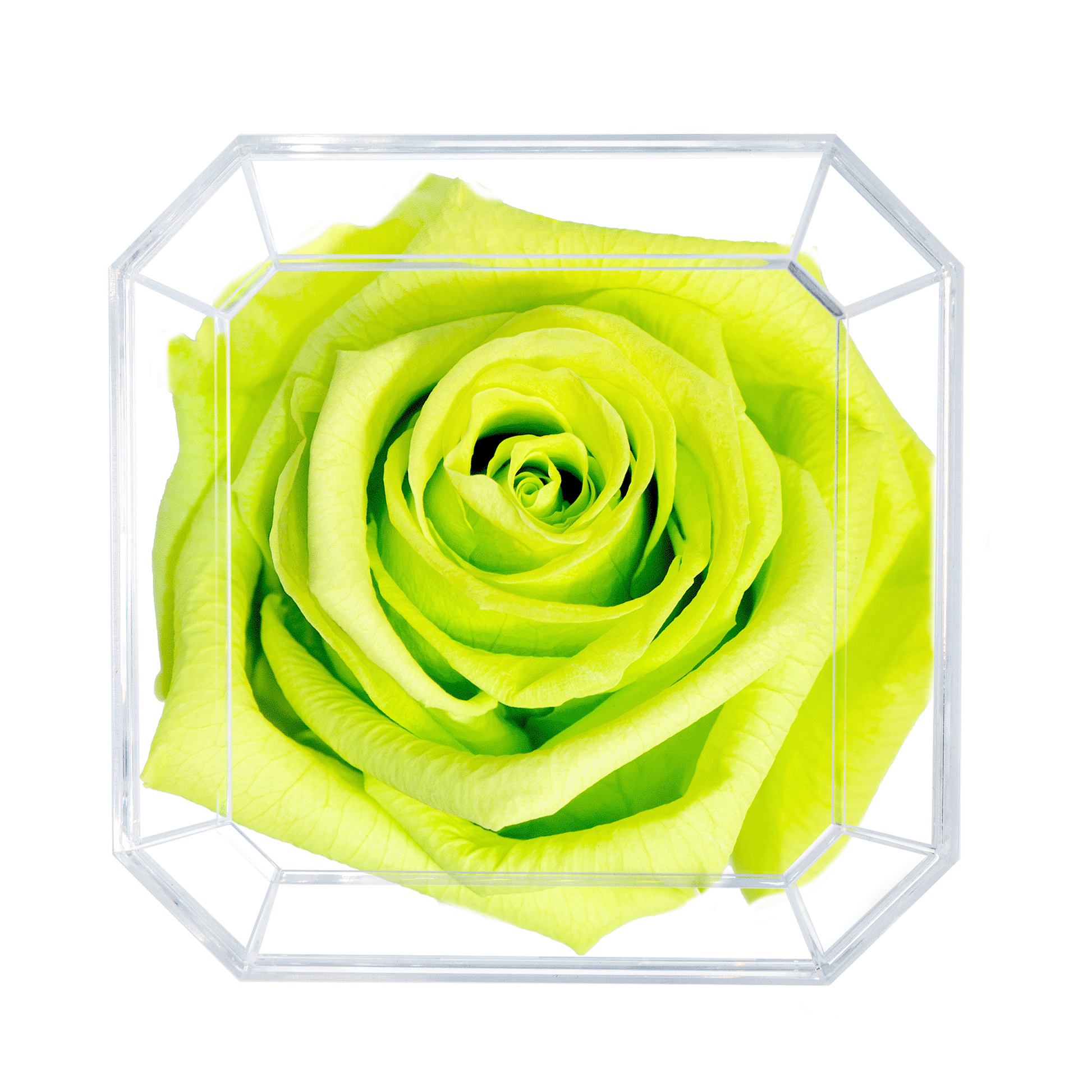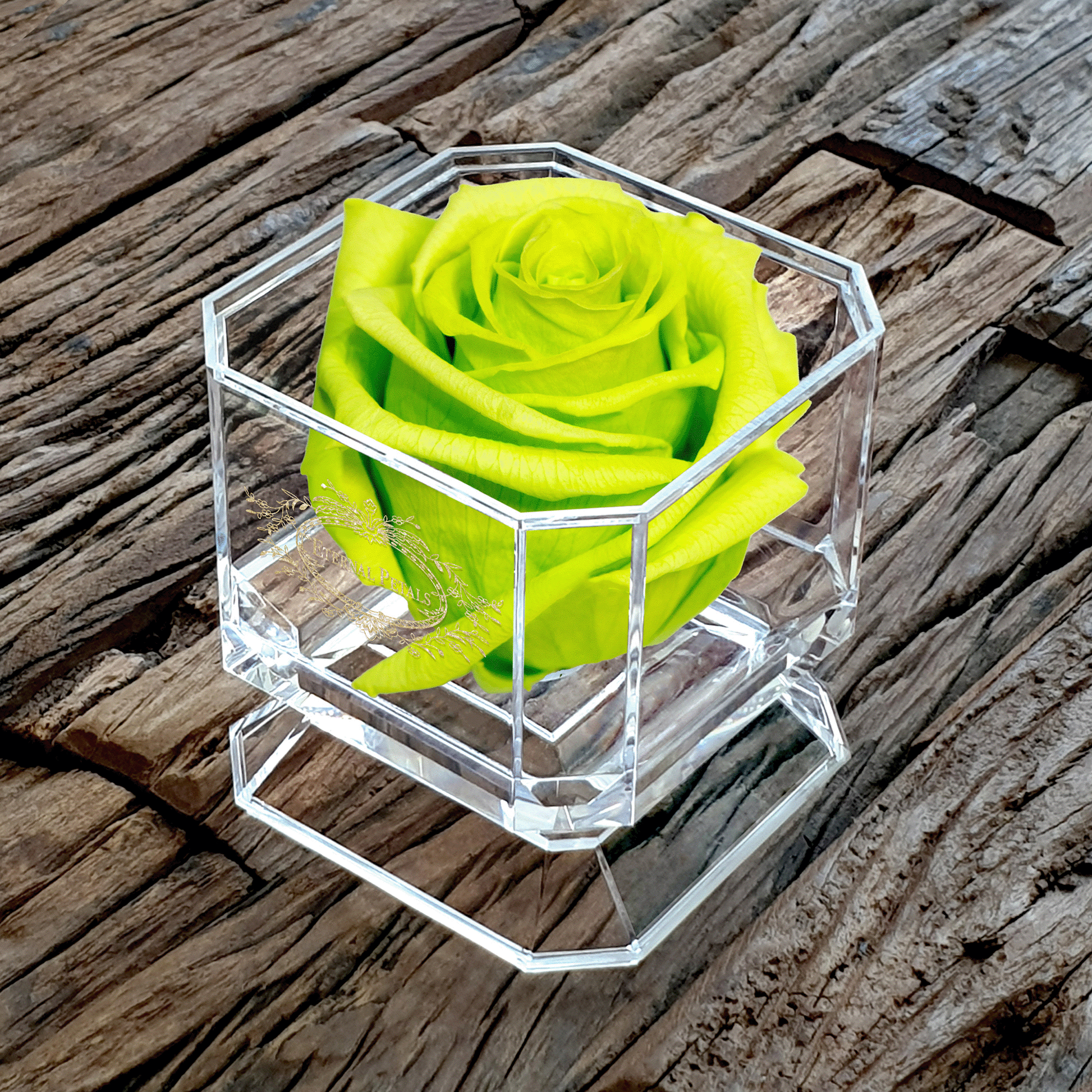 In the pictures you can see a vivid green colour rose inside our trendy acrylic box.
