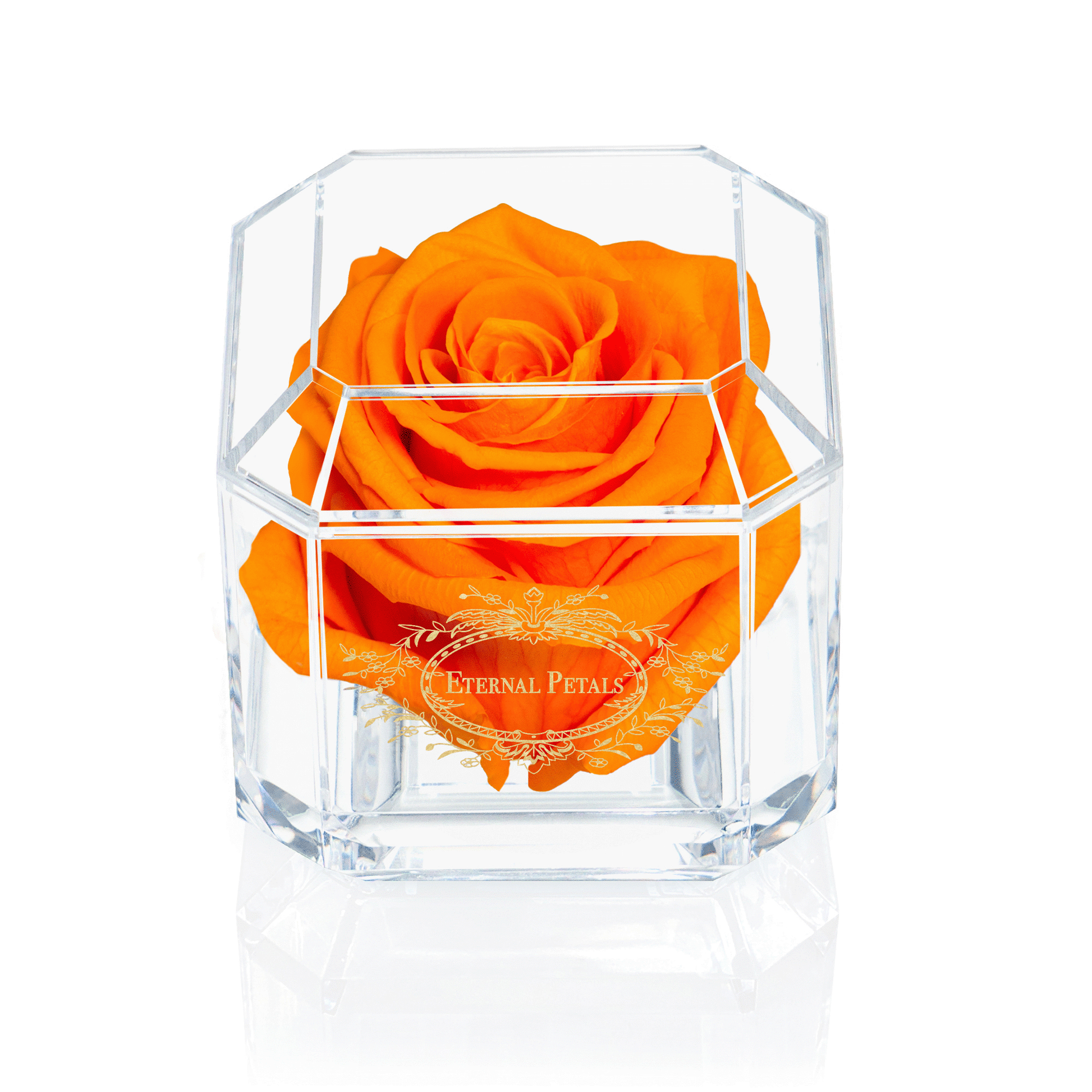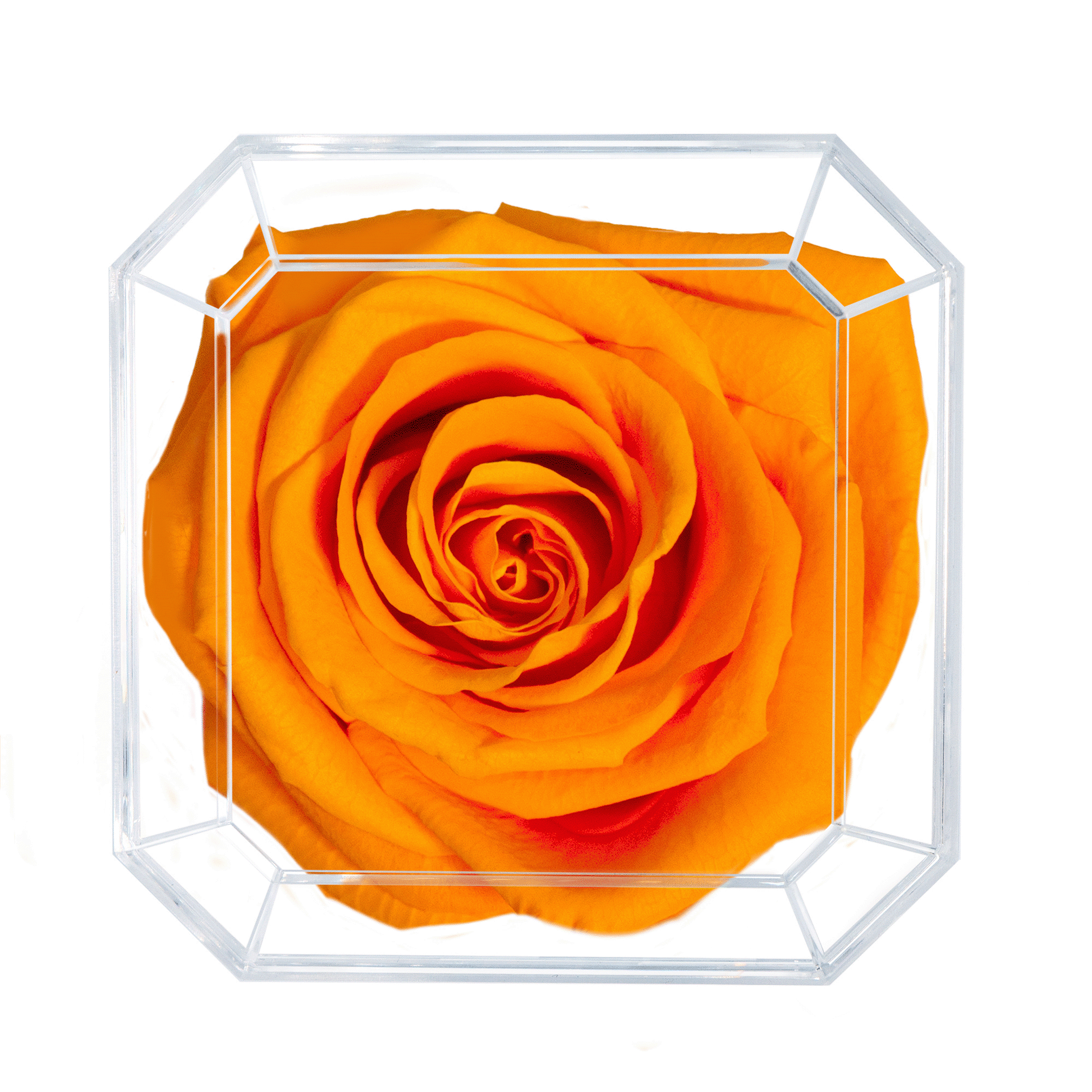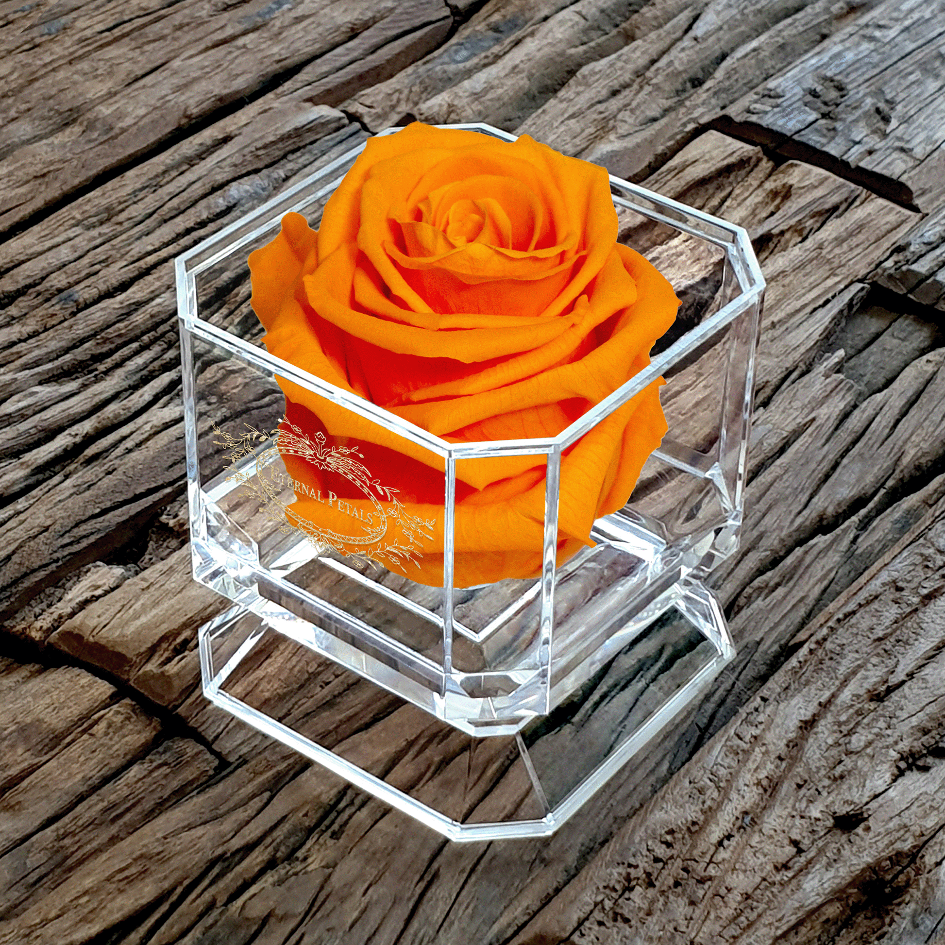 In the pictures you can see a Orange Flame colour rose inside our trendy acrylic box.