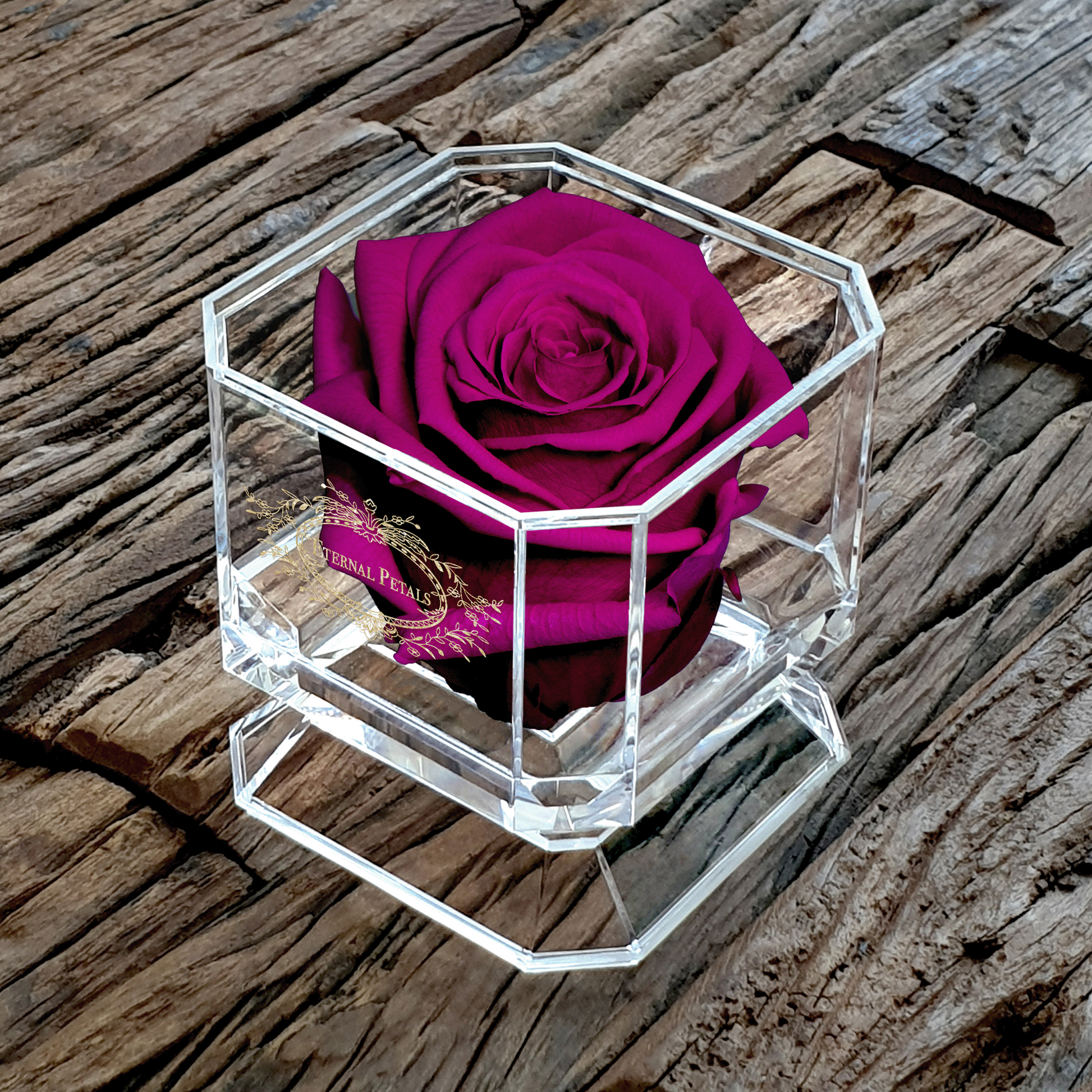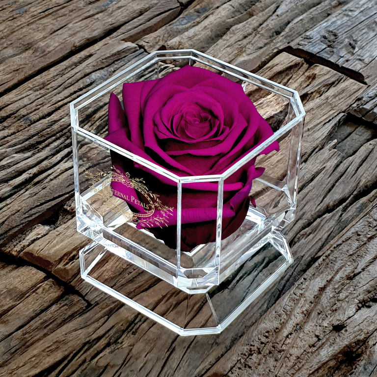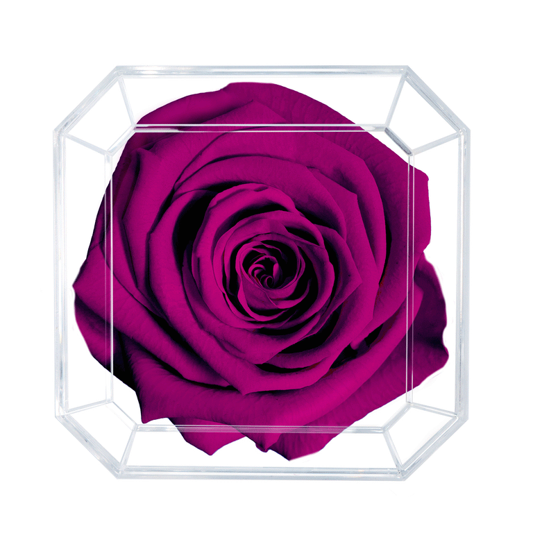 In the pictures you can see a Plum colour rose inside our trendy acrylic box.