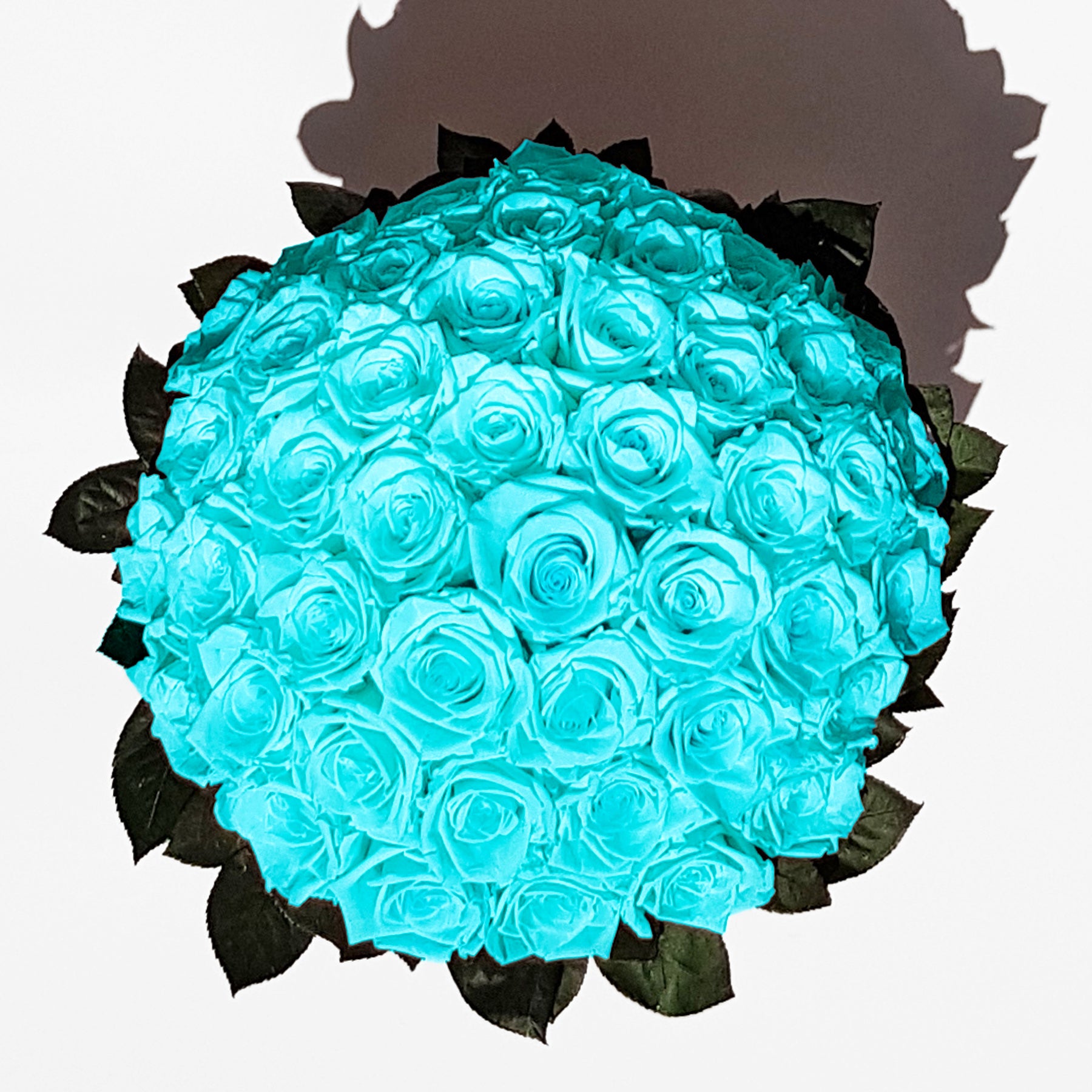 Arriving in this stunning German crystal vase, you’ll find 45-50 perfectly bloomed, Tiffany blue colour roses in authentically beautiful color. These flowers are the symbol of innocence and purity, which you can enjoy and admire for a whole year.