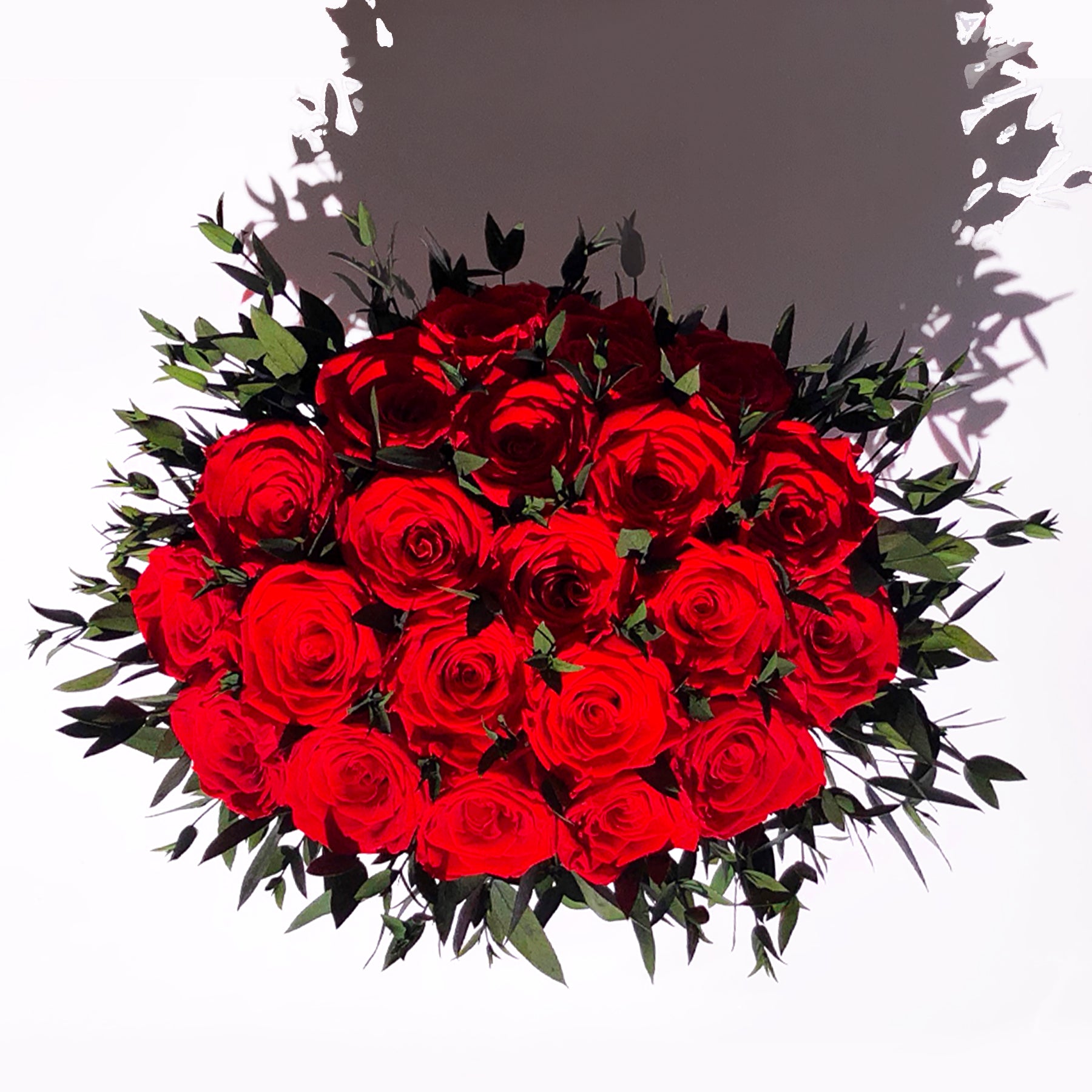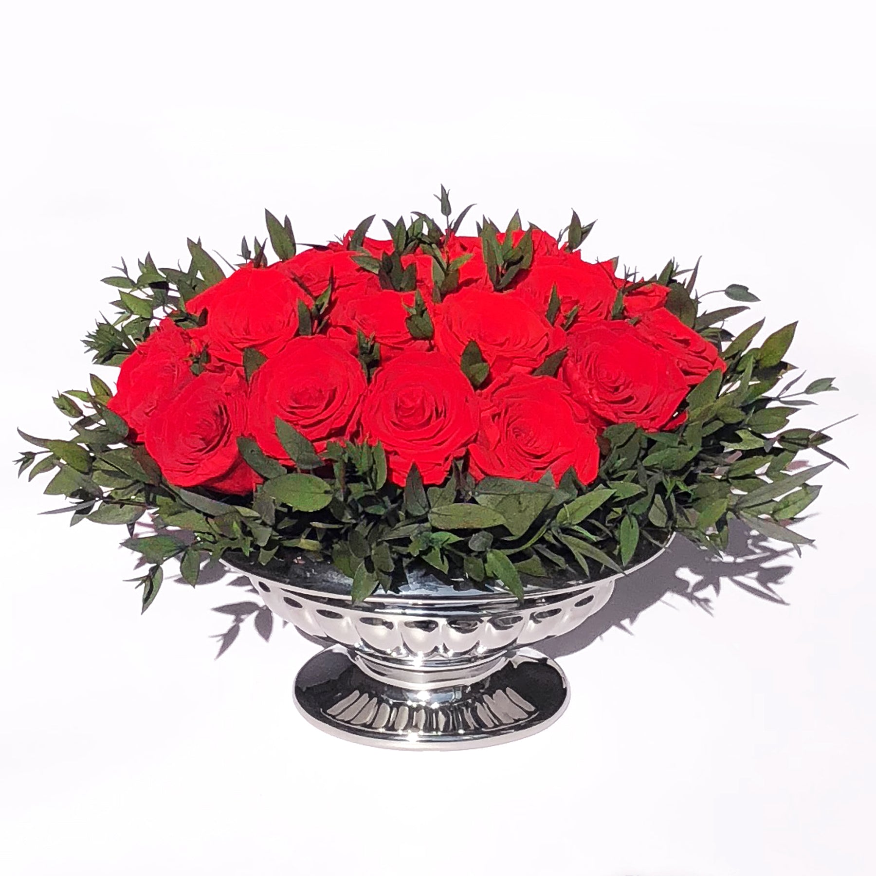 Arriving in a silver ceramic vase, you’ll find idyllic perfectly bloomed, real roses mixed with folliage in authentically beautiful colour. The ultimate in classic romance, which you can enjoy and admire for a whole year.