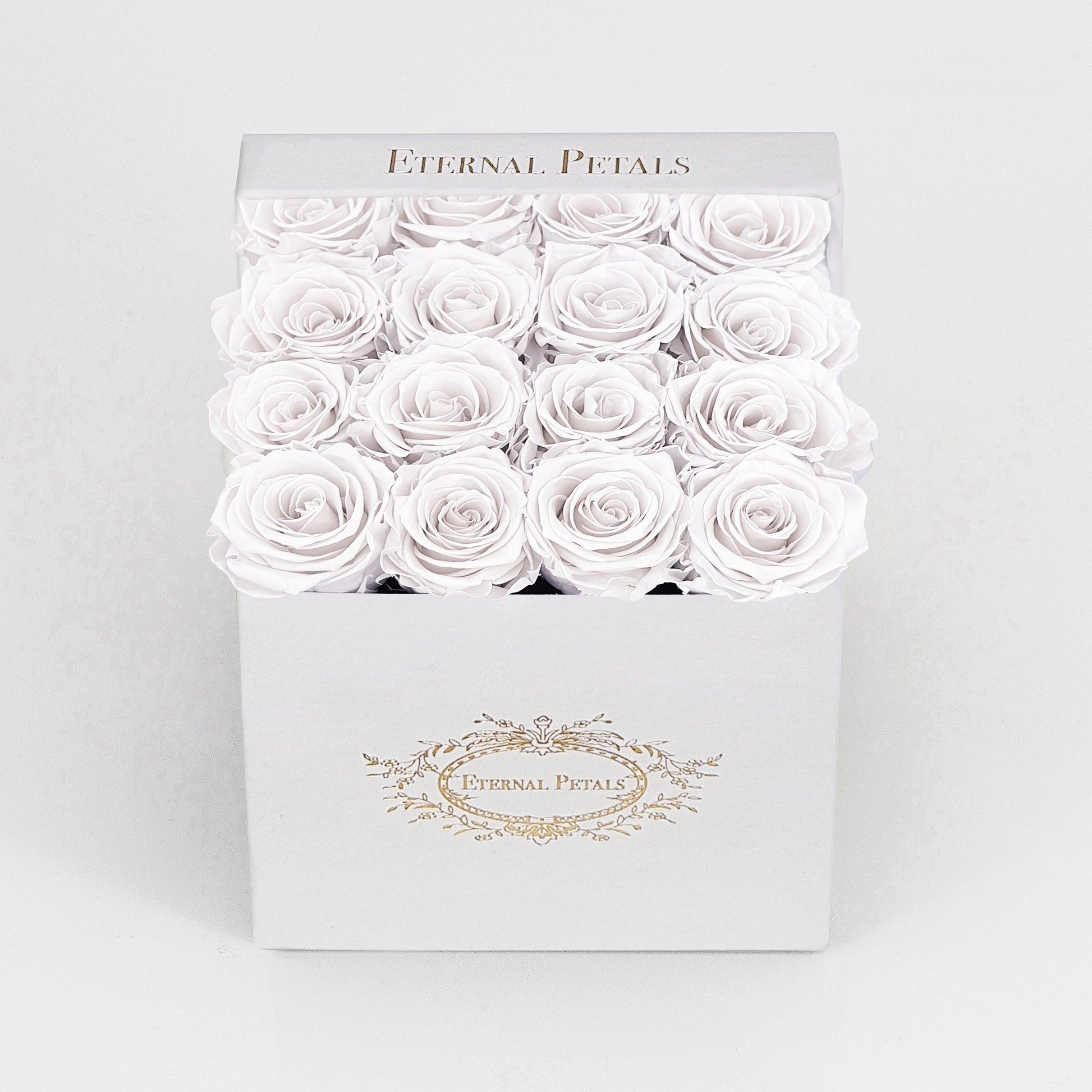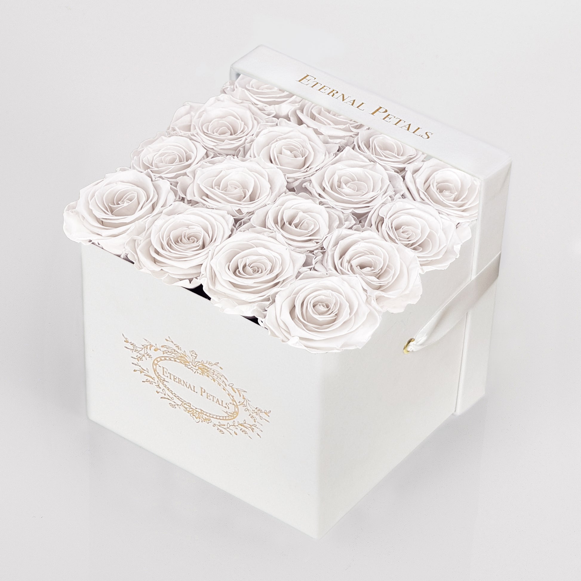 These stunning white satin roses peek romantically out of their beautiful white flower box, creating a luxurious glam finish. A shimmery and rich alternative to a white rose, the white satin roses are sumptuous and unique, perfect to pair in an elegant and contemporary home or for a sweet token of love. The perfect gift!